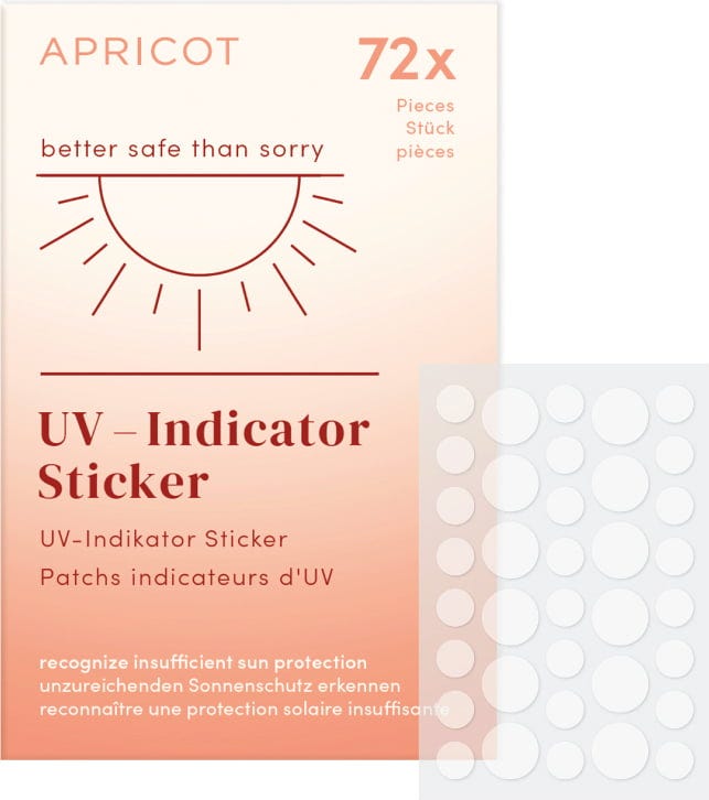 Las pegatinas indicadoras de rayos UV de APRICOT te ayudan a reconocer cuándo tu piel no recibe suficiente protección solar. Al cambiar de color, la pegatina muestra la intensidad de los rayos UV sobre tu piel. De esta manera, siempre sabes cuándo es el momento de volver a aplicar el protector solar. Las pegatinas son resistentes al agua y al sudor.