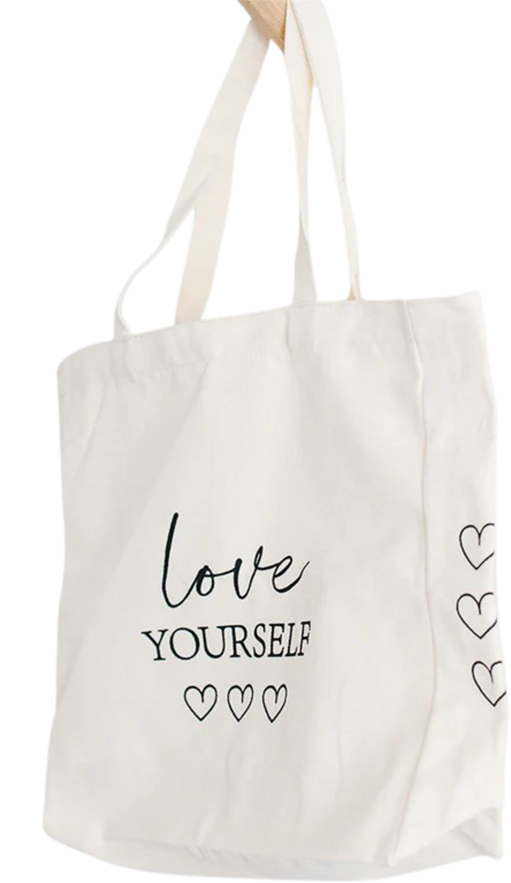Esta espaciosa bolsa de robusto tejido de algodón es a la vez práctica y expresiva: las palabras "Love Yourself" (quiérete) adornan la parte delantera, mientras que la bolsa ofrece espacio suficiente para tus objetos de uso diario.
