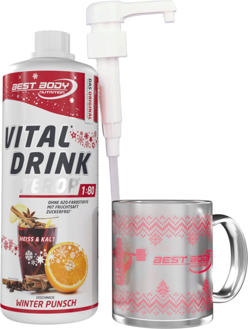 El paquete de invierno de Best Body Nutrition contiene todo lo que necesitas para preparar una bebida de frutas baja en calorías y sin azúcar: la bebida Vital Drink ZEROP® Winter Punsch en botella de 1000 ml, la taza navideña a juego y una bomba dosificadora. La bebida destaca por su sabor natural y su zumo de frutas, enriquecido con vitaminas A, C, E, B1, B6 y niacina. Con solo unas 2,5 kcal por ración, puedes disfrutar fácilmente del ponche de invierno, ideal para tomar en casa o fuera de ella.