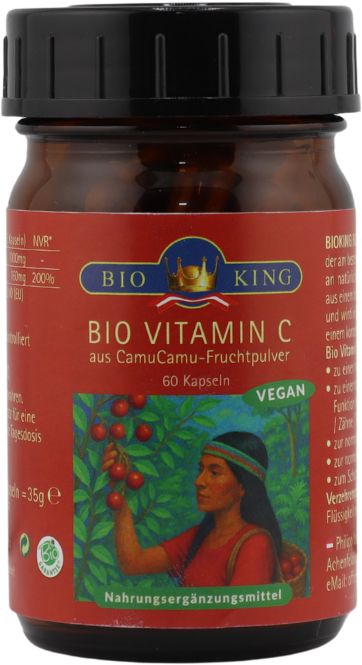 La vitamina C en polvo en cápsulas se obtiene a partir de bayas de camu camu en estado bruto. Las bayas proceden de una zona de la Amazonia peruana certificada como ecológica. El procesamiento especialmente cuidadoso da como resultado un polvo concentrado de calidad orgánica pura, libre de aditivos y completamente vegetal.