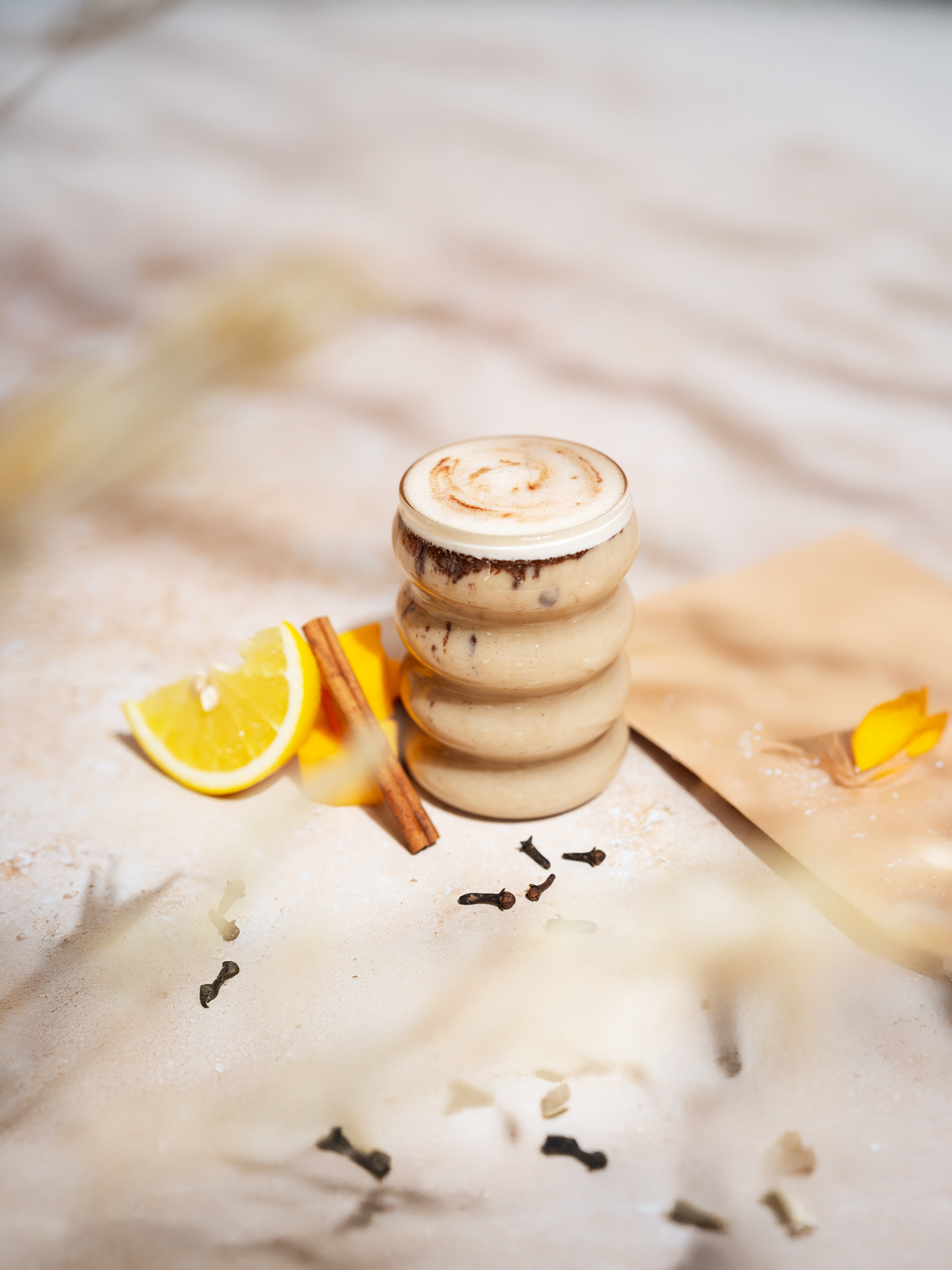 89,4 % Avena fermentada[1], inulina[1], canela[1], espesante (harina de goma guar[1]), cardamomo (Elettaria cardamomum)[1], 0,4 % Extracto de reishi (Ganoderma lucidum)[1], jengibre[1], pimienta[1], clavos[1], anís estrellado[1], macis[1]