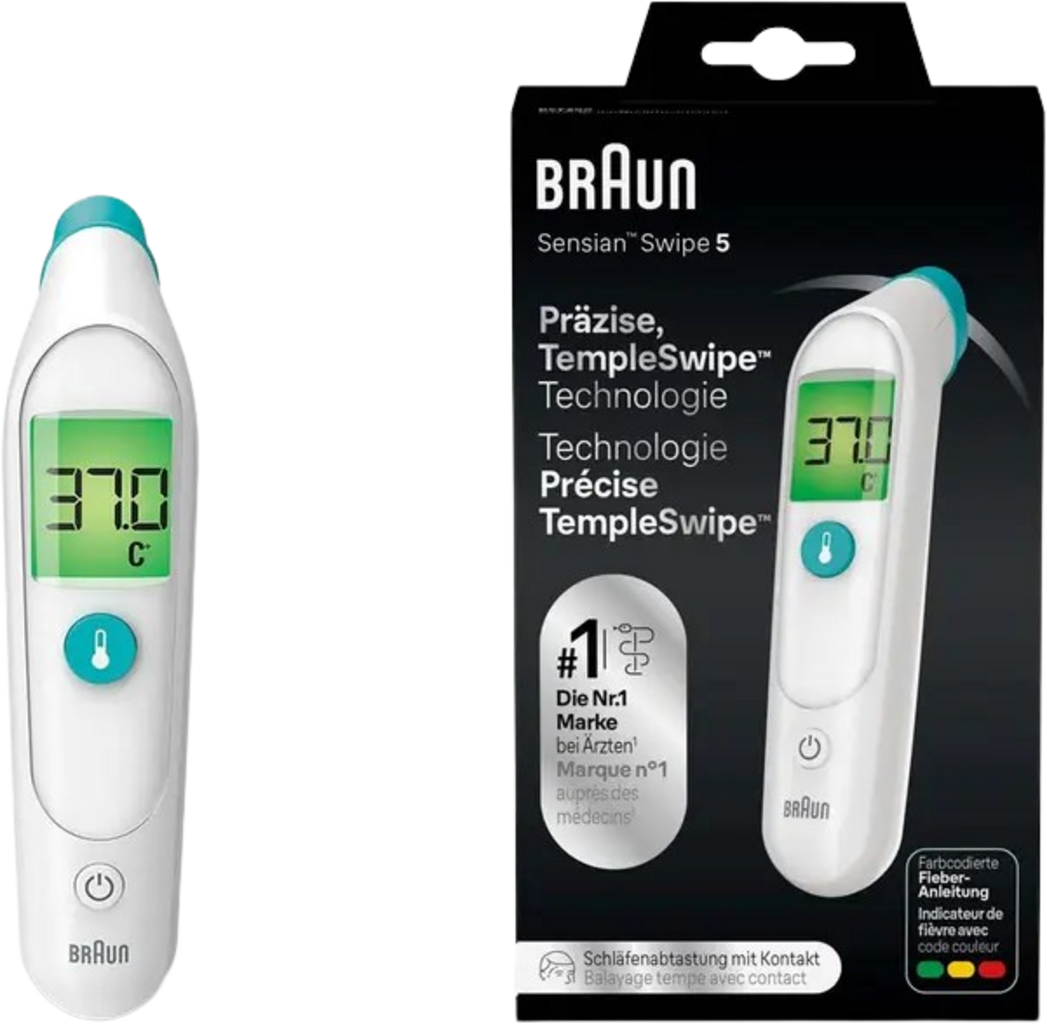 TempleSwipe™ BST200 de Braun, es un innovador termómetro frontal para bebés, niños y adultos. Gracias a la probada tecnología TempleSwipe™, la temperatura se mide con un suave roce en la arteria temporal, lo que garantiza mediciones especialmente cómodas, higiénicas y precisas.