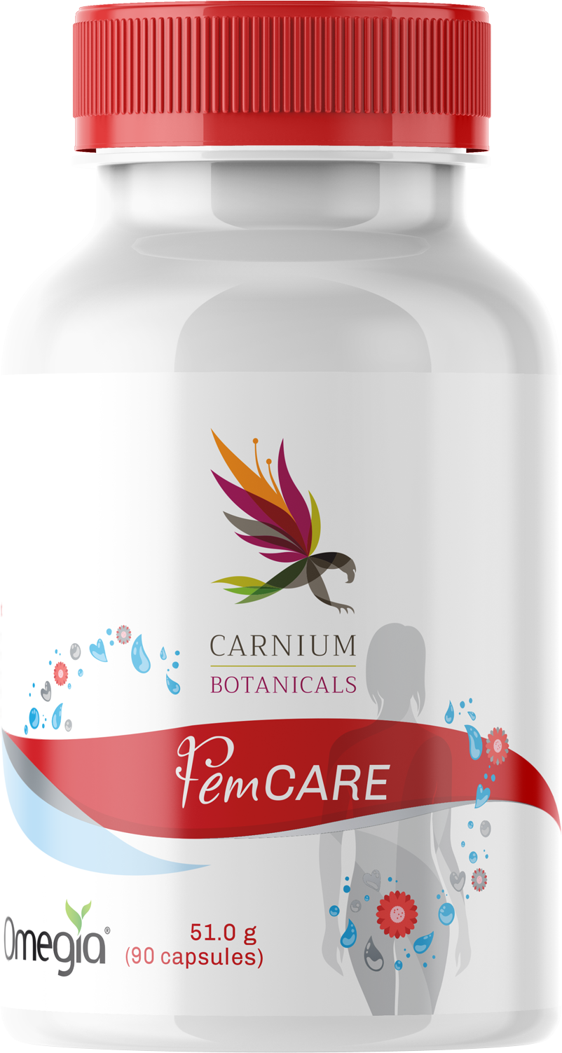 Las cápsulas FemCARE de Carnium Botanicals están enriquecidas con espino amarillo (Omegia®), noni, ginkgo y calcio. La formulación es completamente natural, vegana y sin conservantes.