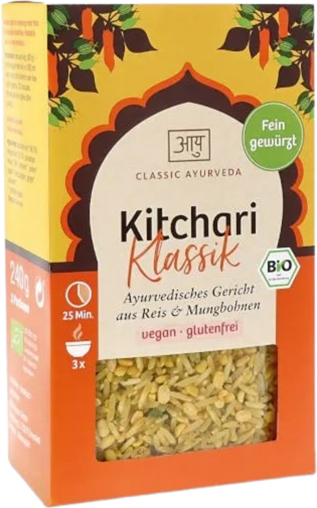 Un producto ideal para llevar a la mesa un plato ayurvédico absolutamente delicioso en el menor tiempo posible. El kitchari clásico bio de Classic Ayurveda es una sabrosa combinación de arroz, alubias mungo y verduras, condimentado con numerosas especias ayurvédicas.