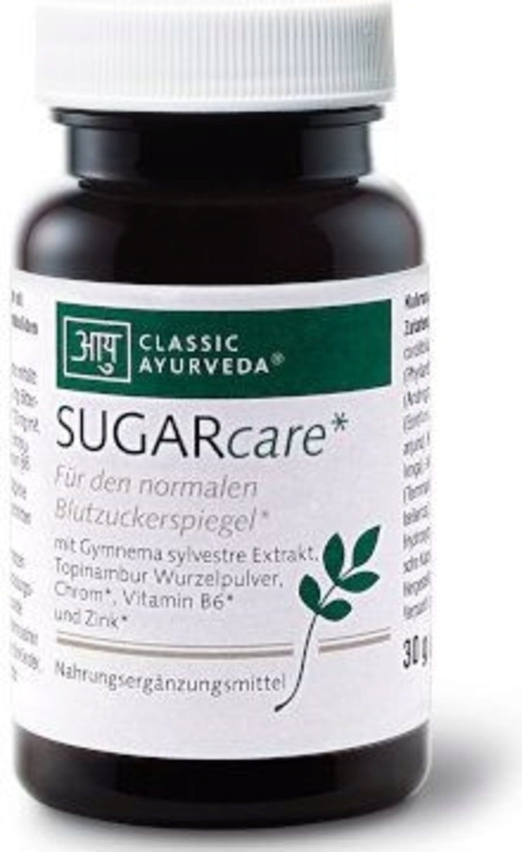 24 % Extracto de hoja de gurmar (Gymnema sylvestris), 14 % topinambur en polvo, extracto de amla (Amalaki, Emblica officinalis), extracto de guduchi (Tinospora cordifolia), Extracto de (Curcuma longa), triphala en polvo (Emblica officinalis, Baheda (Bibhitaki, Terminalia bellirica), mirabolano índico (Haritaki, Terminalia chebula)), 0,5 % óxido de zinc, ingrediente de relleno (celulosa), antiaglomerante (ácido silícico (dióxido de silicio)), 0,14 % vitamina B6 (piridoxina), 0,004 % cloruro de cromo (III), hidroxipropilmetilcelulosa (Celulosa vegetal)