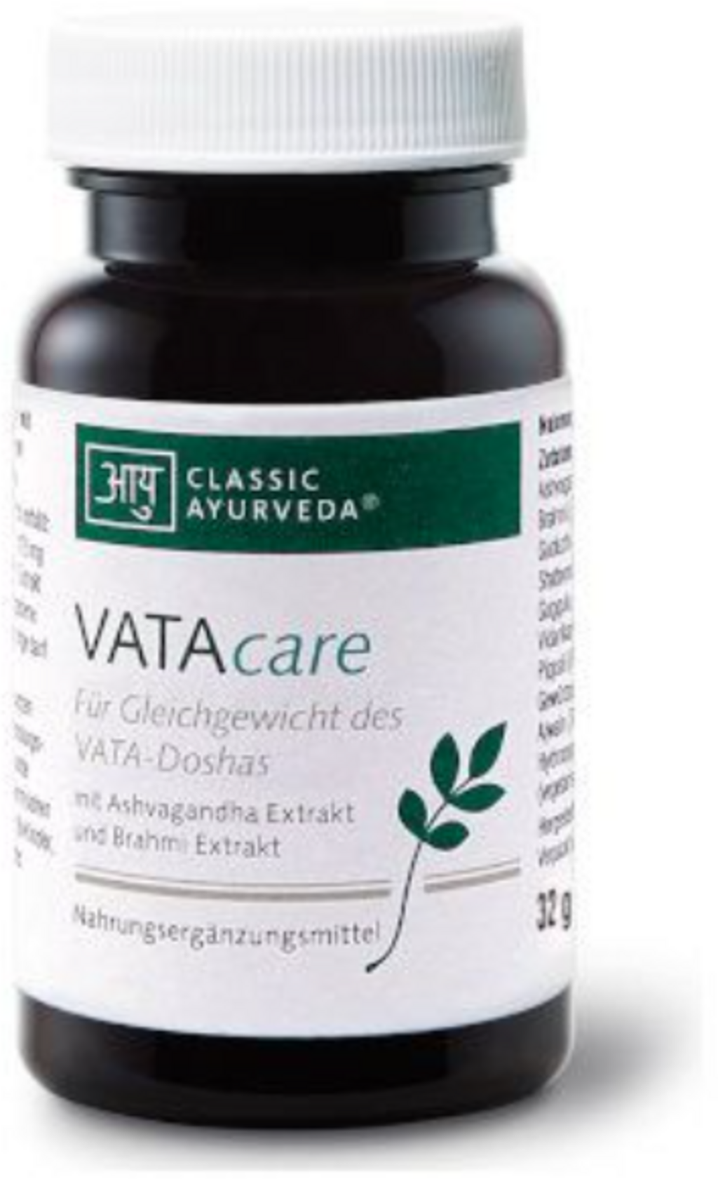 Las cápsulas VATAcare de Classic Ayurveda ofrecen una composición tradicionalmente equilibrada de extractos vegetales indios. La fórmula se basa en Ashvagandha y Brahmi, enriquecidos con Shatavari, Tulsi, Guduchi y Guggulu, además de Vidarikand. La mezcla se completa con las especias Trikatu Pippali, pimienta y jengibre.
