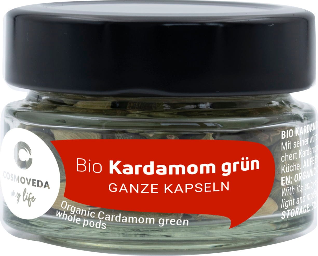 El cardamomo verde contiene semillas negras muy aromáticas que se utilizan molidas para postres, refinar bebidas, leche y café. Las semillas promueven la digestión. El cardamomo es una de las especias más antiguas y valiosas del mundo, justo después del azafrán y la vainilla. Incluso los antiguos griegos y romanos conocían esta especia. La especia proviene del sur de la India, pero hoy también se encuentra en Sri Lanka, Guatemala, Tanzania y Brasil.