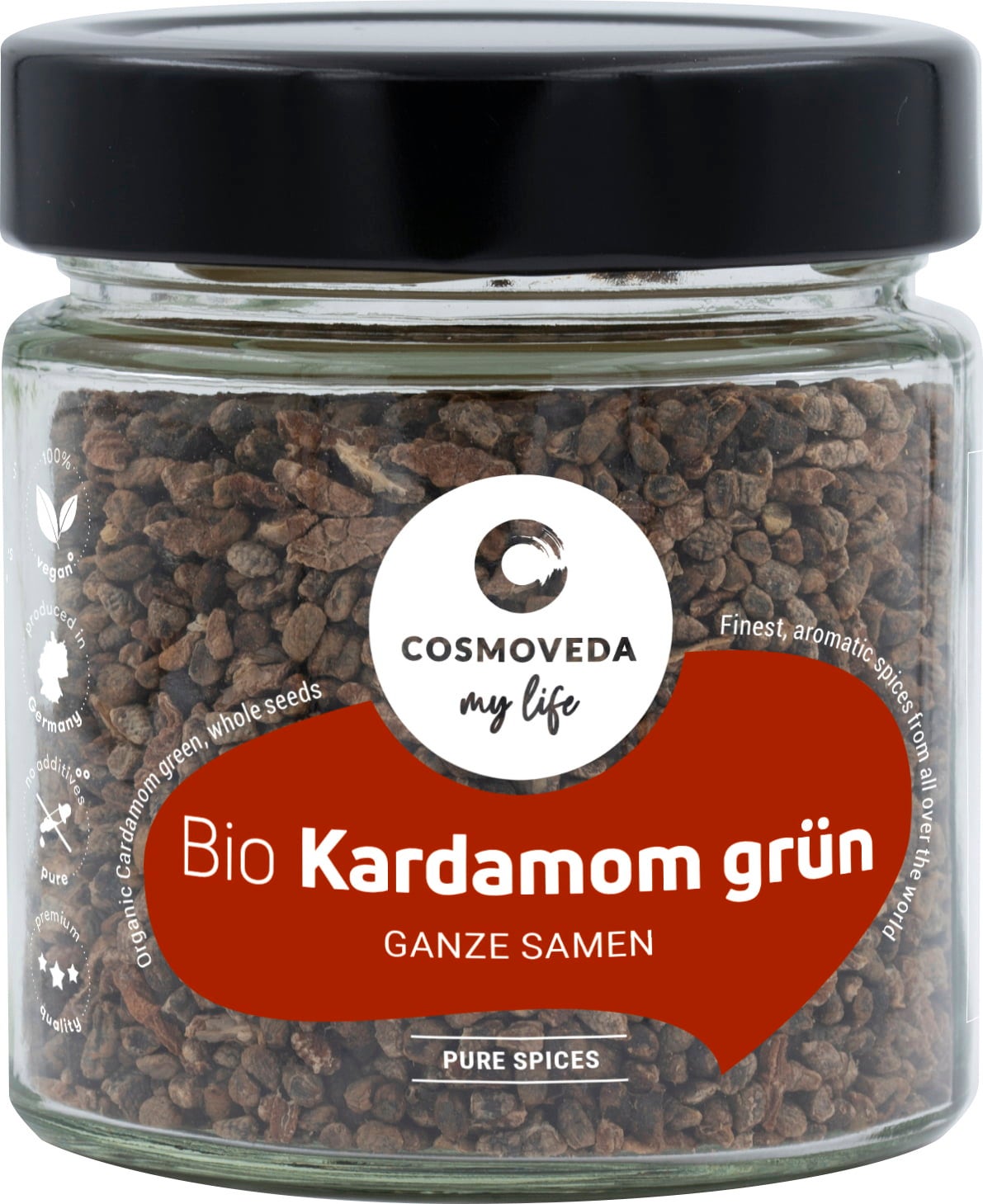 Las semillas negras del cardamomo verde se utilizan molidas para postres, refinar bebidas, leche y café. Las semillas promueven la digestión. El cardamomo es una de las especias más antiguas y valiosas del mundo, justo después del azafrán y la vainilla. Incluso los antiguos griegos y romanos conocían esta especia. La especia proviene del sur de la India, pero hoy también se encuentra en Sri Lanka, Guatemala, Tanzania y Brasil.