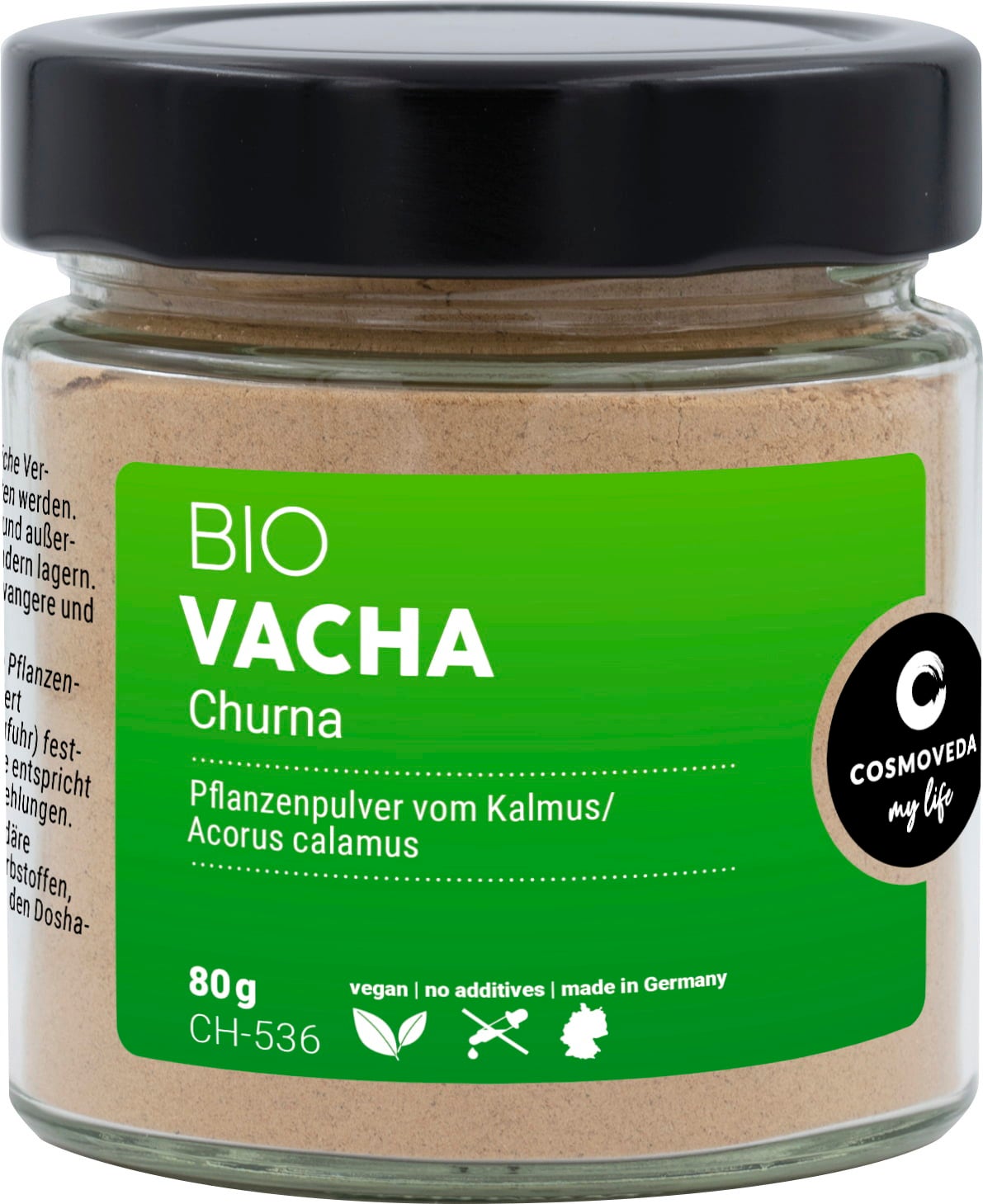 Vacha - Acorus calamus - es una planta de 60-100 cm de altura, de tallo triangular, hojas en forma de espada y pequeñas flores verdes. En la dieta ayurvédica, se utiliza la raíz. En la producción de este producto se ha tenido en cuenta un molido suave (por debajo de 40° C) para la realización de polvo de la raíz seca de cultivos ecológicos y de comercio justo de la India y Sri Lanka.