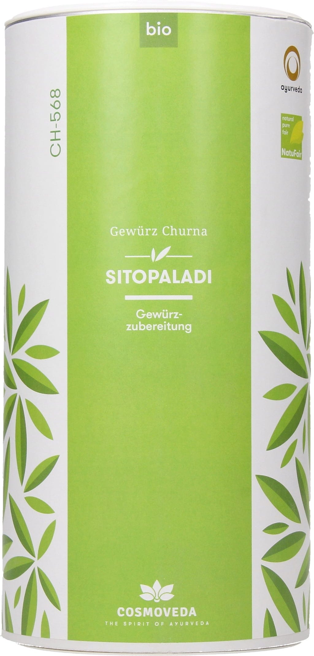 BIO Sitopaladi Churna de Cosmoveda contiene una mezcla de hierbas ayurvédica de Pippali, cardamomo, canela, vamsalochana (Bambusa arundinacea) y azúcar de caña integral de calidad bio.