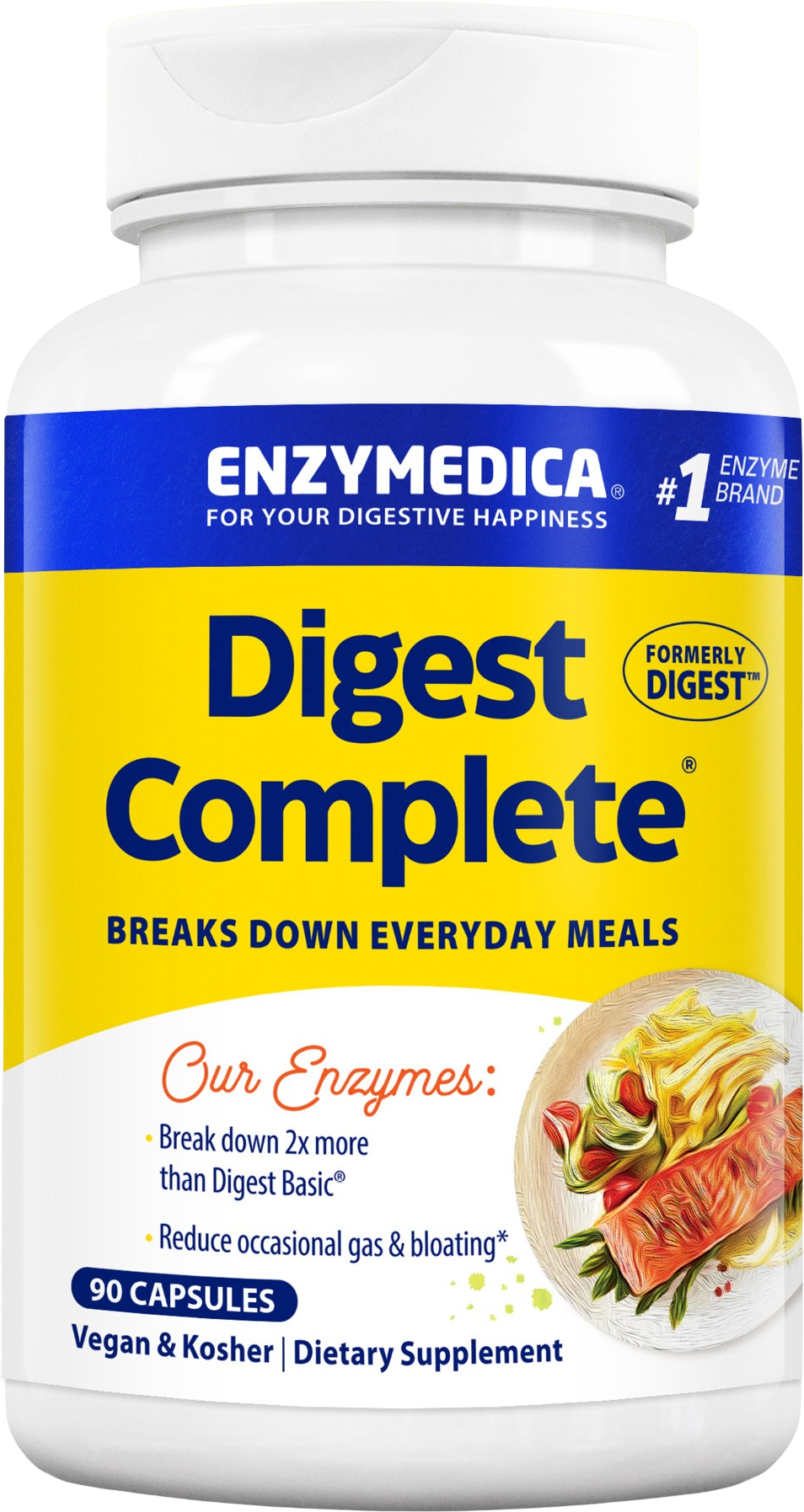 Digest Complete® ofrece una fórmula completa de enzimas especialmente desarrollada para descomponer carbohidratos, grasas, fibra y proteínas. Gracias a la tecnología Thera-blend® que contiene, las enzimas permanecen activas en todo el espectro de pH del cuerpo. La fórmula también contiene lactasa. Las cápsulas son puramente vegetales, kosher y se fabrican sin ingeniería genética, soja ni gluten.