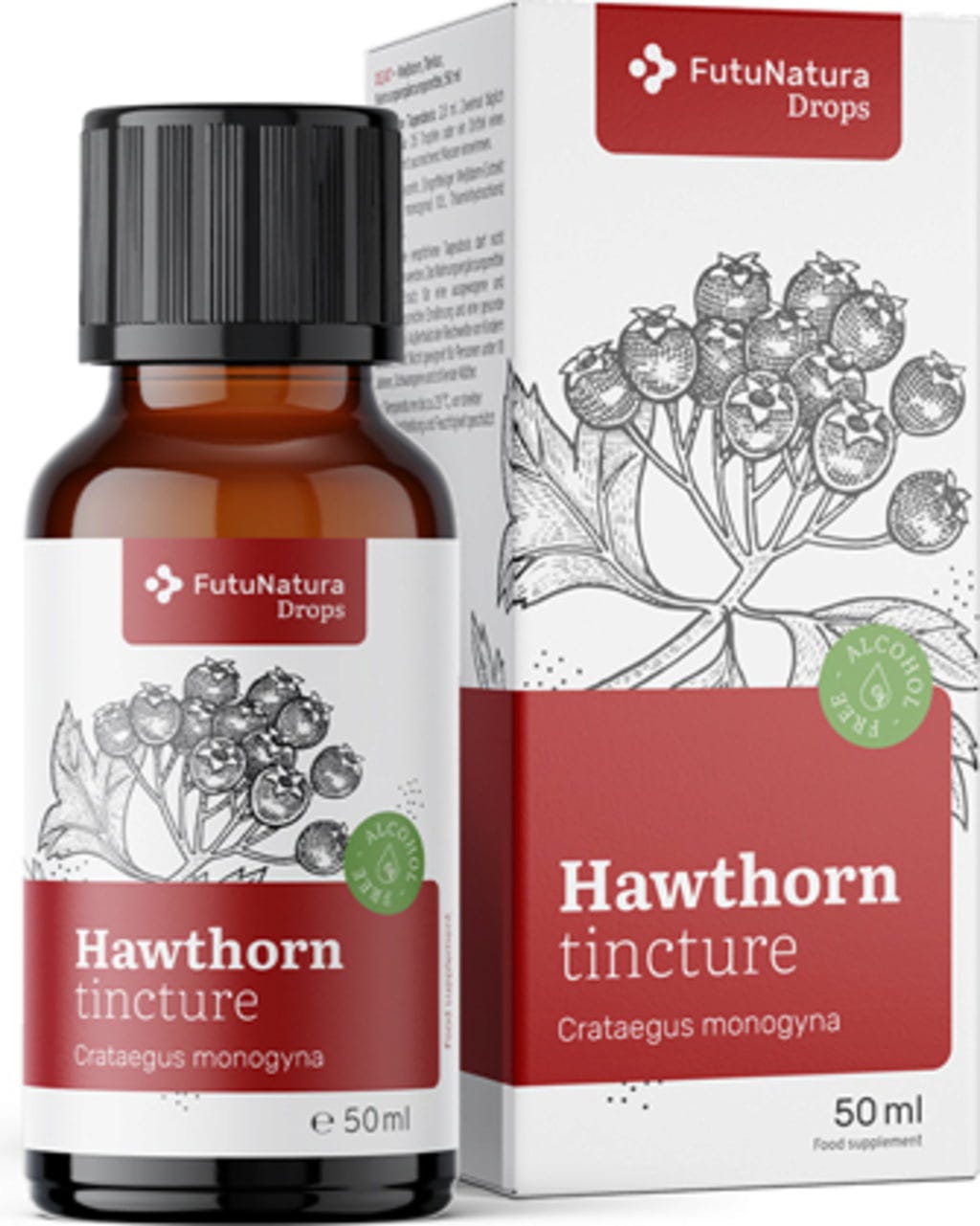 La tintura de espino blanco pertenece a la línea de productos FutuNatura Drops y se presenta en un frasco con cuentagotas para permitir una dosificación fácil y precisa.