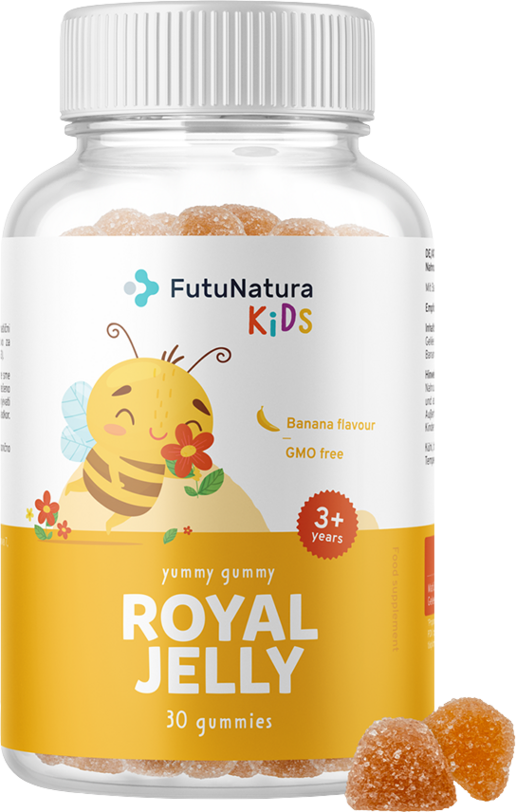 Las gominolas Royal Jelly de FutuNatura Kids contienen jalea real, un valioso producto de las abejas. Tienen sabor a plátano y miel y no contienen OMG.