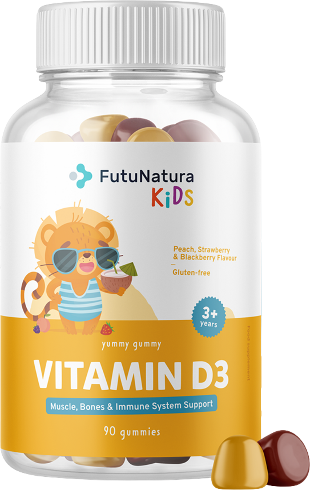 Las gominolas Vitamin D3 de FutuNatura Kids contienen vitamina D3, también conocida como la vitamina del sol. Son sin gluten y tienen sabores afrutados como melocotón, fresa y grosella negra.