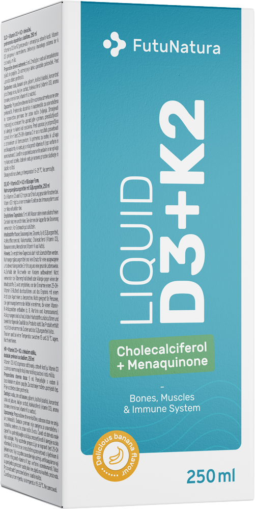 Líquido de FutuNatura que aporta vitaminas D3 y K2. La vitamina D contribuye al mantenimiento de huesos normales. La vitamina K2 se presenta en forma de menaquinona-7 (MK-7). Además, Vitamina D3 + K2 Líquida está enriquecida con aceite MCT de coco. El práctico tapón permite una dosificación sencilla.