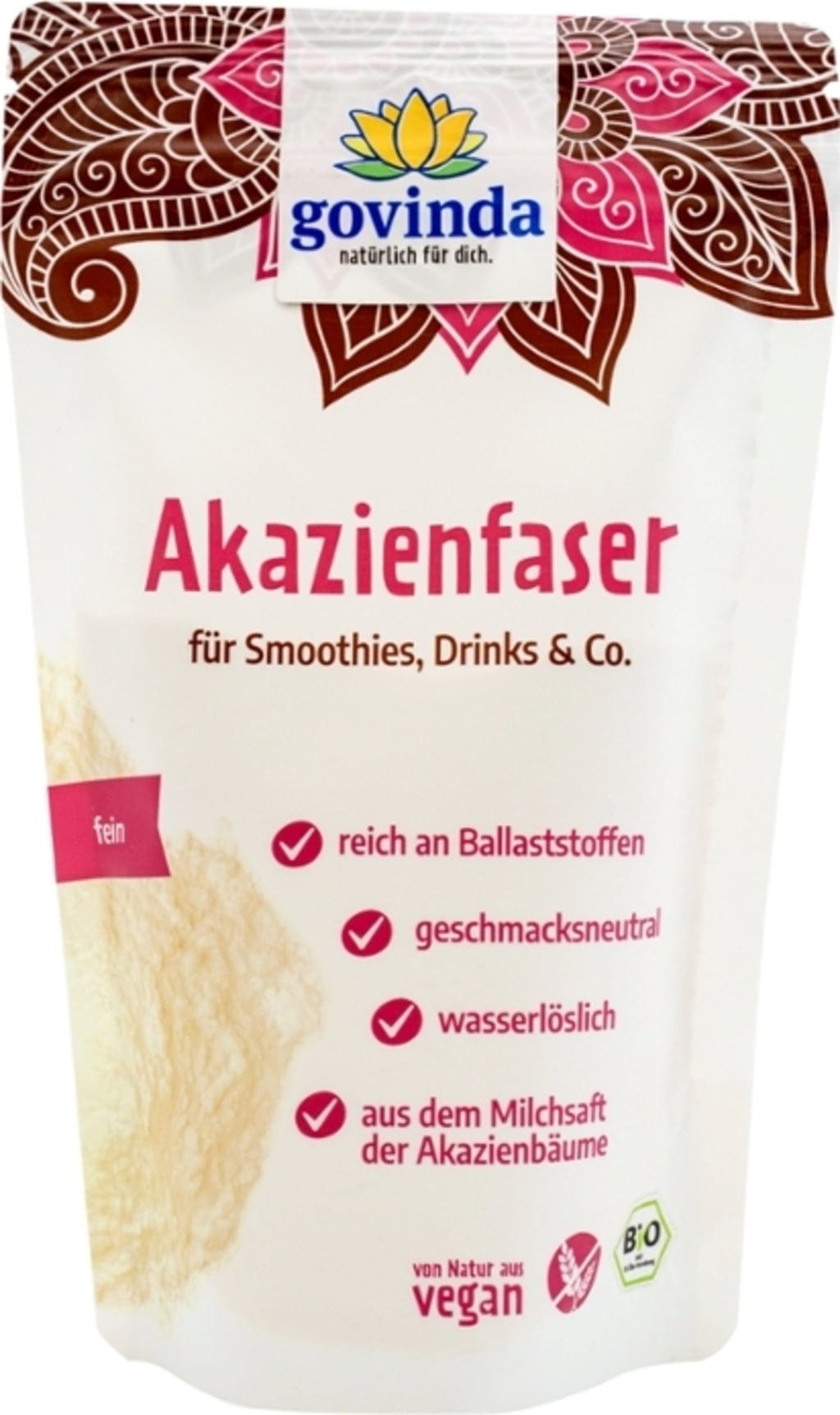 La fibra de acacia bio de Govinda se obtiene mediante el secado delicado de la savia lechosa de acacias silvestres. El polvo fino tiene un sabor neutro y se integra fácilmente en bebidas, batidos o en el muesli diario. Al tratarse de fibras hidrosolubles, la consistencia de las preparaciones permanece inalterada. Un complemento de alta calidad procedente de la agricultura bio controlada, sin aditivos artificiales.