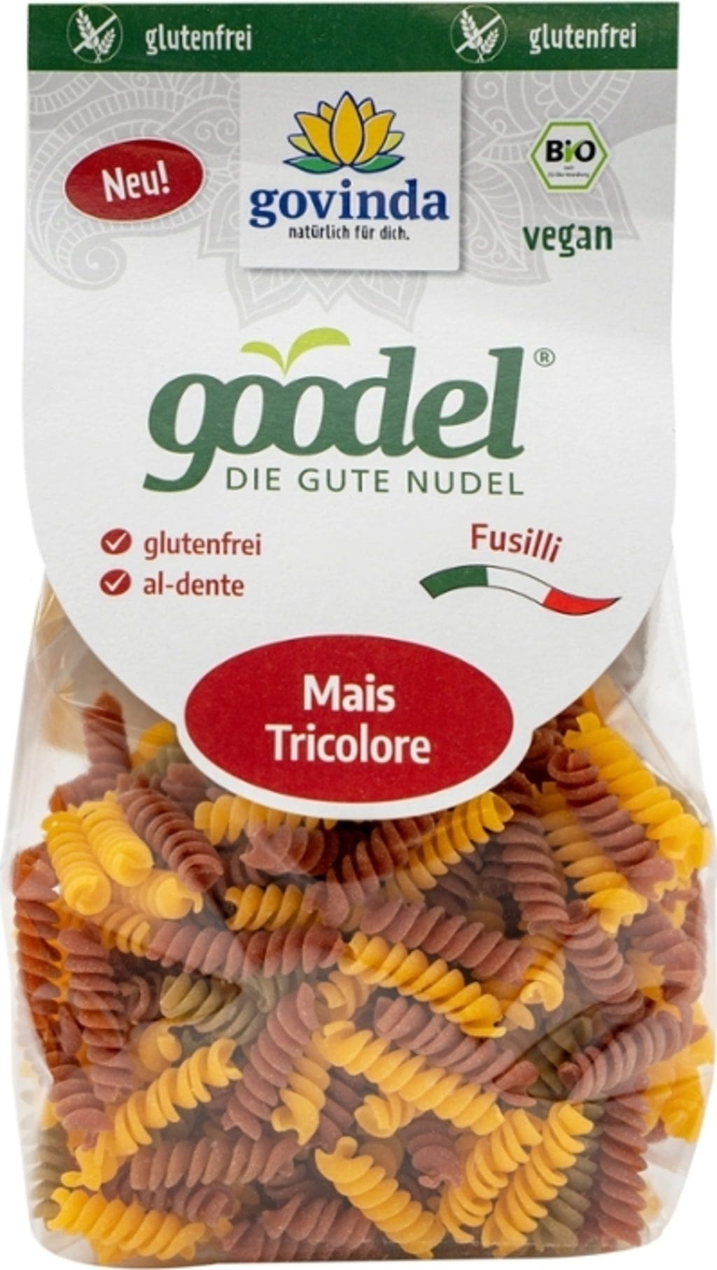 Los Goodel Fusilli Tricolore de Govinda aportan colores al plato. Esta pasta bio está elaborada con harina de maíz y coloreada de forma natural con remolacha y espinacas. Enriquecida con una parte de harina de quinoa, ofrece una textura clásica al dente y un sabor delicado. Una opción ideal y sin gluten para platos variados y creativos en la cocina familiar.
