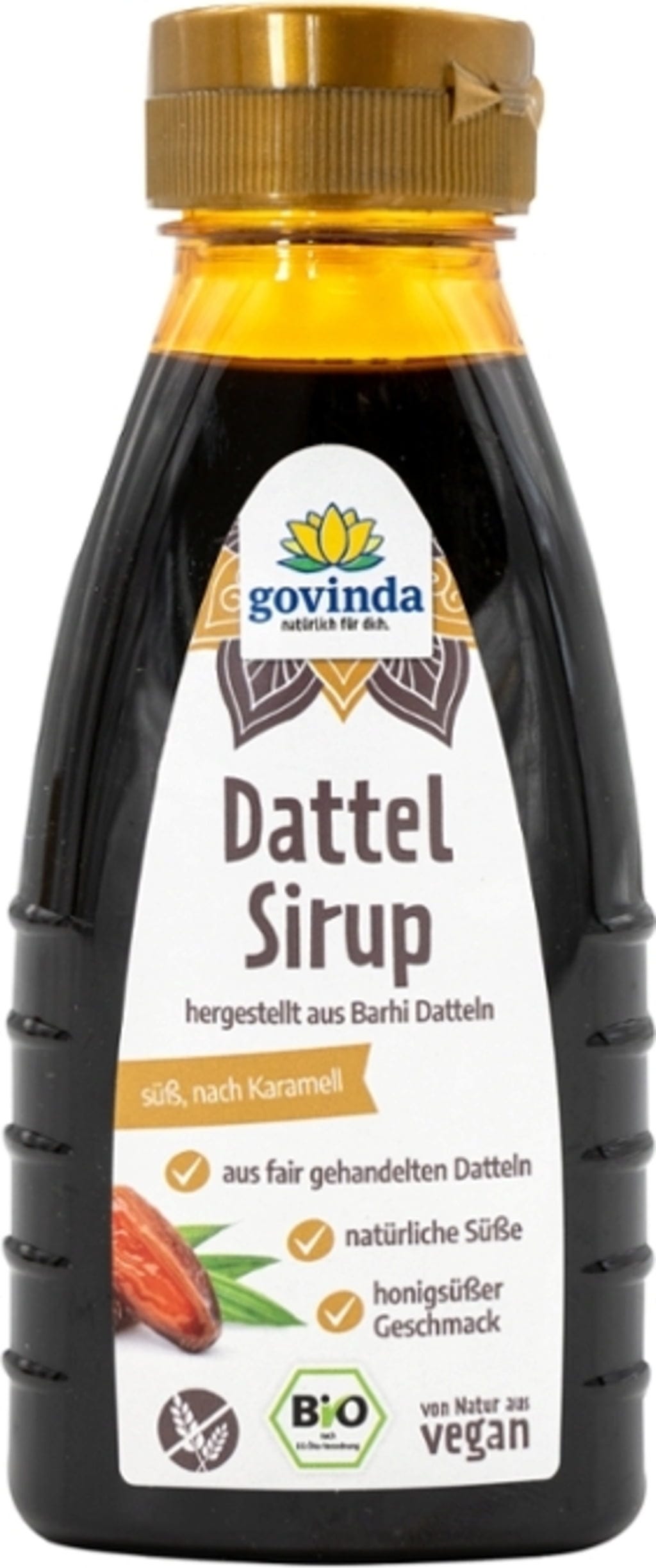 El sirope de dátiles bio de Govinda se obtiene a partir de dátiles Barhi aromáticos y seduce por su consistencia dorada. Es una alternativa totalmente vegetal a la miel o al sirope de arce y enriquece los postres y las preparaciones ayurvédicas con una delicada nota de caramelo. Un producto natural puro, sin aditivos.
