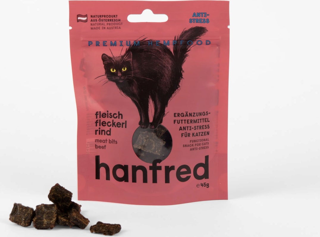 Si su gato reacciona con sensibilidad a los cambios o a las situaciones estresantes, este snack puede ser una opción adecuada. Hanfred Meat Bites está compuesto por un 95% de carne y un 5% de polvo de cáñamo, sin cereales ni aditivos artificiales.