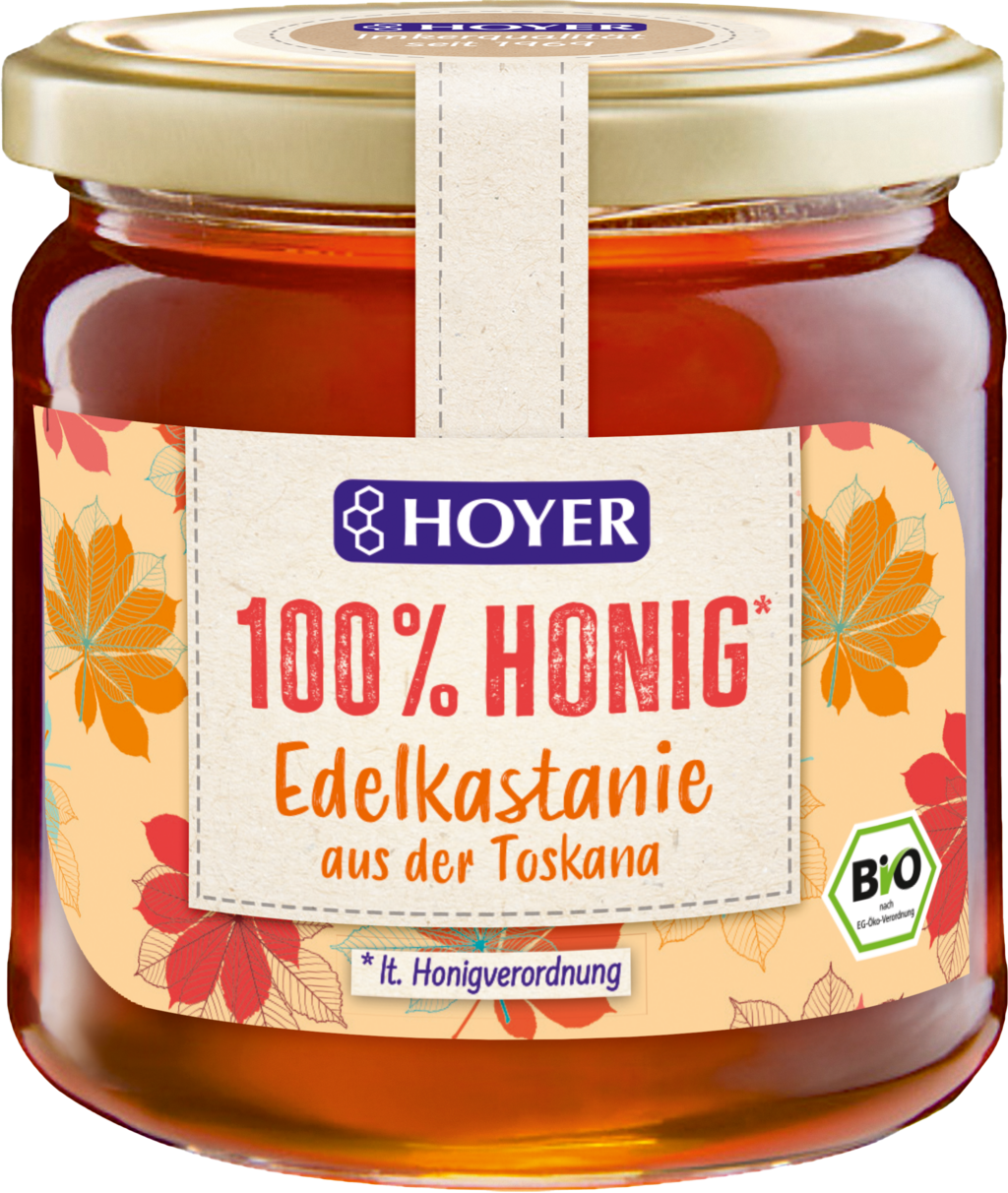 Para esta miel gourmet con un sabor intenso y ligeramente amargo, las colonias de abejas (de la agricultura biológica) recolectan néctar y ligamaza de los bosques de castaños (Castanea sativa) en las regiones montañosas de la Toscana. La miel de castaño tiene un color dorado oscuro y no cristaliza tan rápido.