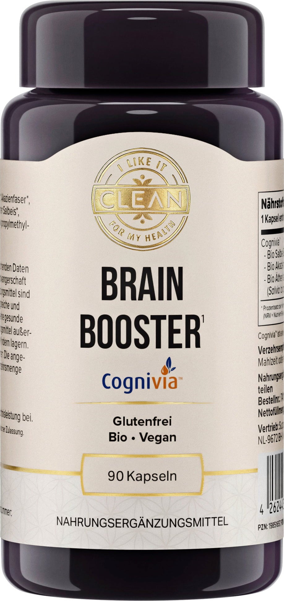 Brain Booster de i like it clean combina extracto de salvia de alta calidad, fibra de acacia y aceite esencial de salvia española en la fórmula única y científicamente probada Cognivia™. Desarrollado para días exigentes, está totalmente libre de cafeína y aditivos artificiales.