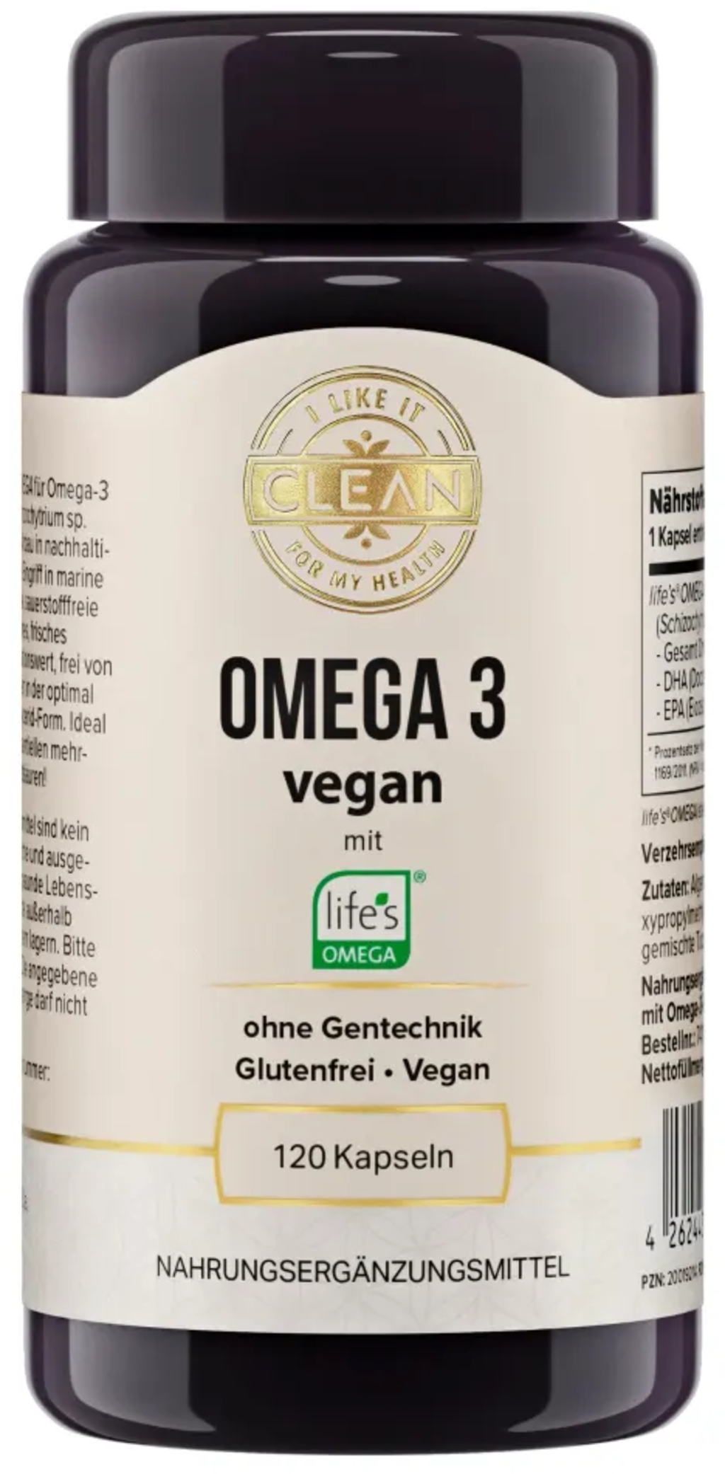 Omega 3 vegano de i like it clean aporta ácidos grasos omega 3 activos directamente de las algas. Cada cápsula contiene 182,5 mg de DHA y 50 mg de EPA, extraídos de la microalga Schizochytrium sp. El aceite de algas procede de la materia prima certificada de la marca life’s® OMEGA. El producto no contiene componentes de origen animal, aceite de girasol, gluten ni organismos modificados genéticamente.