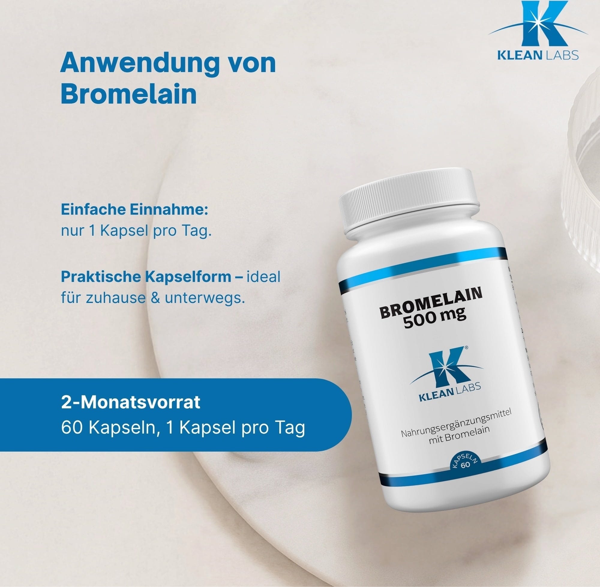 La bromelina se extrae del tallo inferior de la planta de piña y se compone de dos enzimas que descomponen las proteínas. El suplemento dietético contiene 500 mg de bromelina por cápsula, es 100 % vegano y sin OGM.