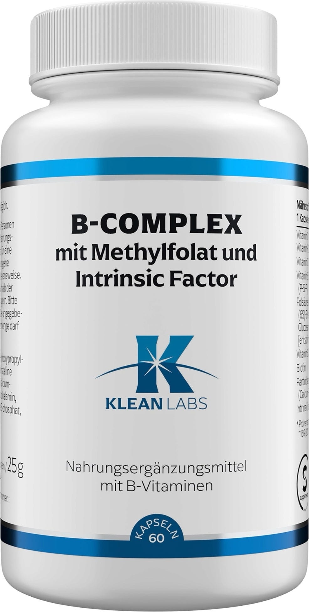 KLEAN LABS B-Complex contiene un complejo de vitaminas B con metilfolato y factor intrínseco. Las vitaminas B incluyen tiamina, riboflavina, niacina, vitamina B6, ácido fólico, vitamina B12, biotina y ácido pantoténico. Las cápsulas no contienen OMG.