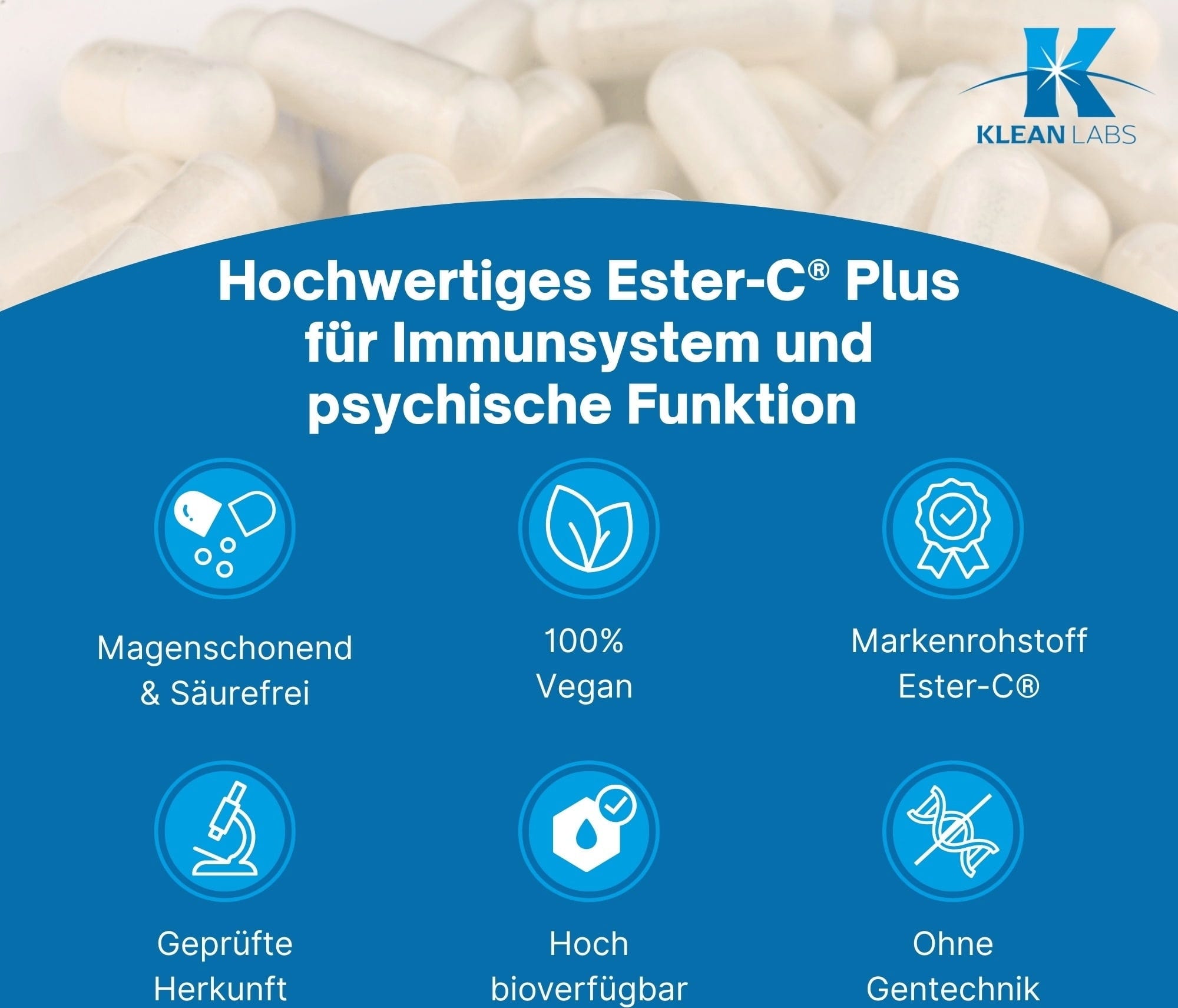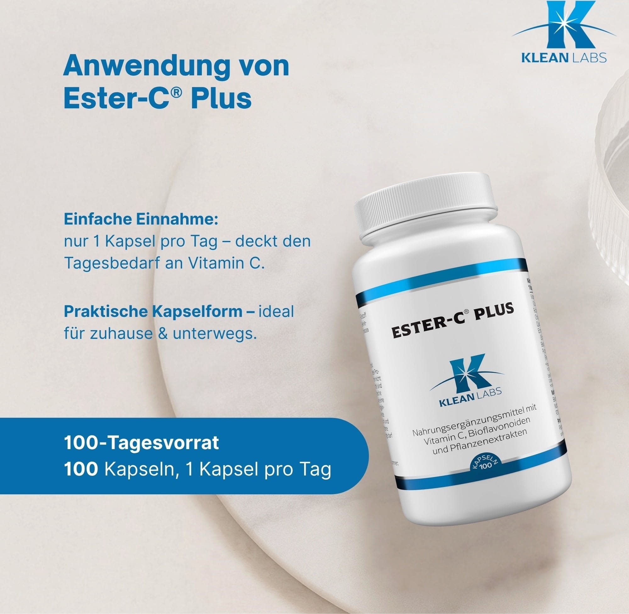 Ester-C® Plus de KLEAN LABS contiene vitamina C libre de ácido, obtenida mediante un proceso de fabricación patentado, y tiene propiedades de liberación sostenida para un suministro a largo plazo de hasta 24 horas. Además, las cápsulas contienen quercetina, extracto de raíz de equinácea, betacaroteno y extracto de corteza de pino marítimo.