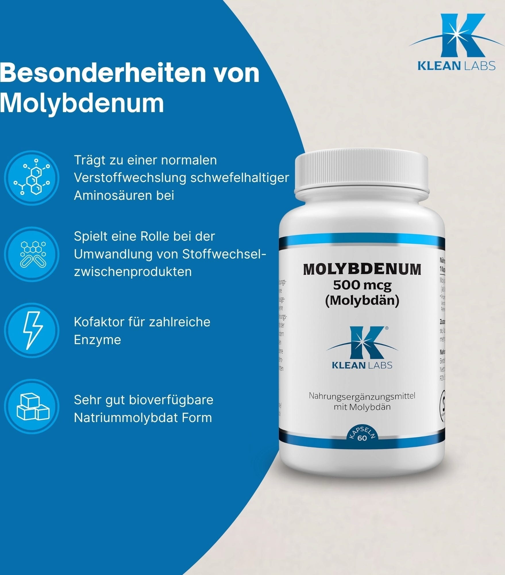 KLEAN LABS Molibdeno 500 mcg, 60 cápsulas vegetales