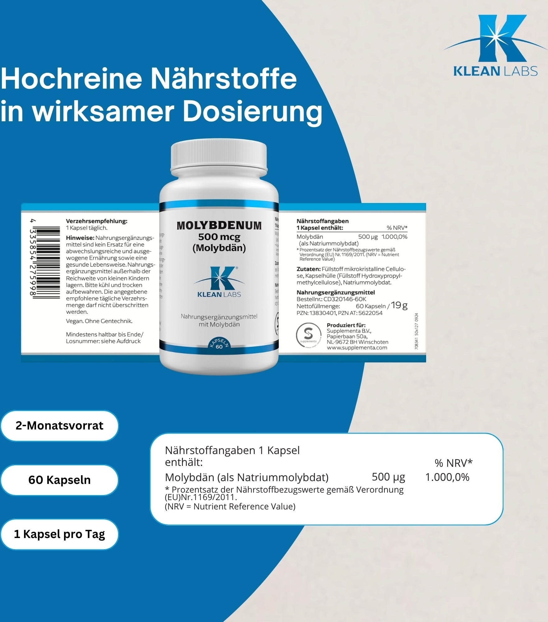 Este producto de Klean Labs contiene 500 µg de molibdeno por cápsula. El suplemento dietético también es 100% vegano y sin OMG.