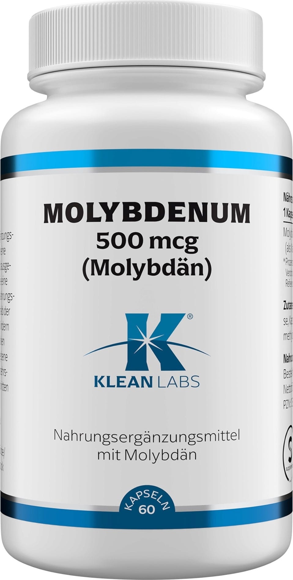 Este producto de Klean Labs contiene 500 µg de molibdeno por cápsula. El suplemento dietético también es 100% vegano y sin OMG.