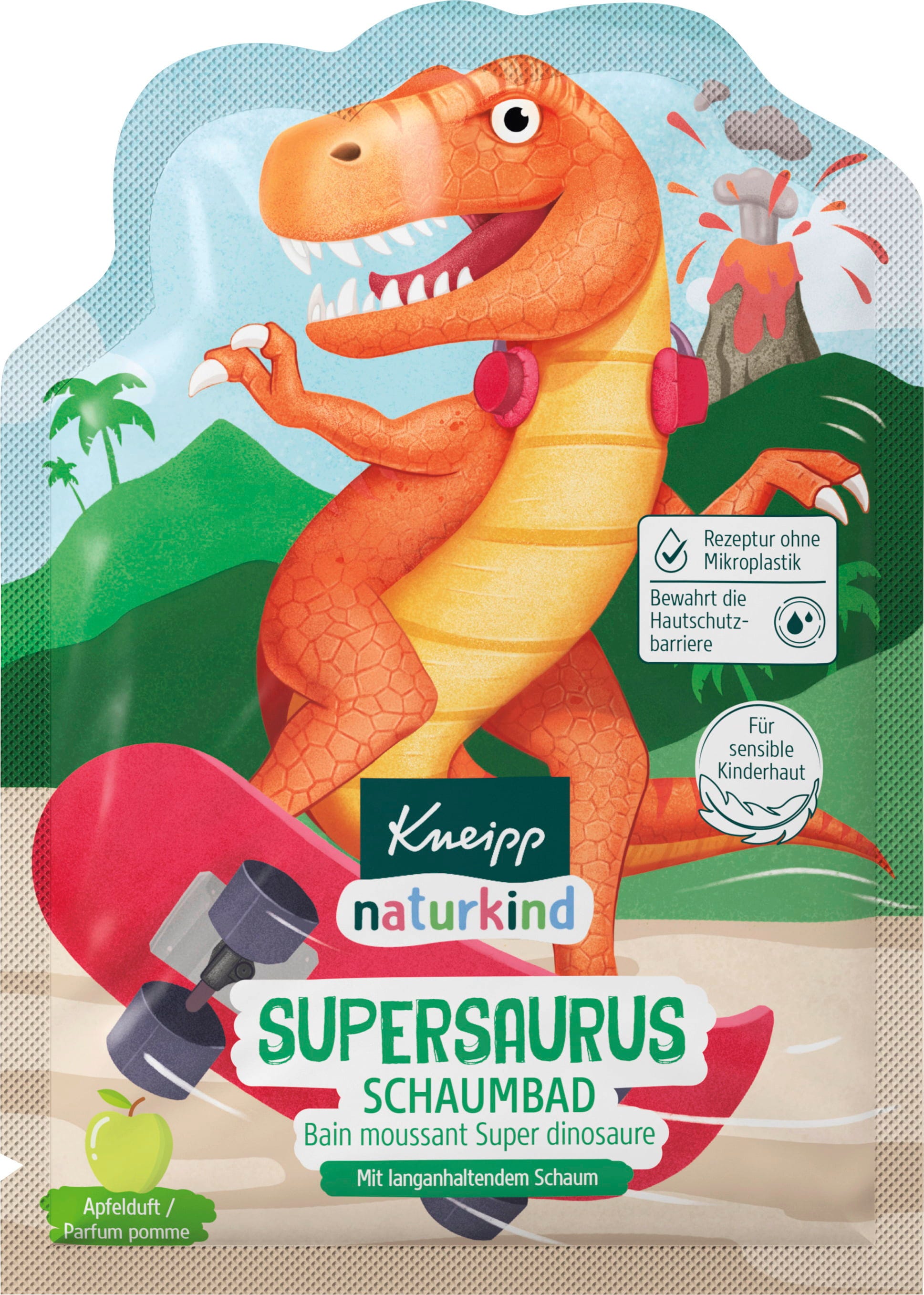 El baño de burbujas Kneipp naturkind Supersaurus transforma el agua del baño en un mar de espuma esponjosa e invita a disfrutar de una experiencia de baño imaginativa. La fragancia afrutada de manzana acompaña la diversión del baño y lo hace aún más emocionante para los pequeños exploradores.