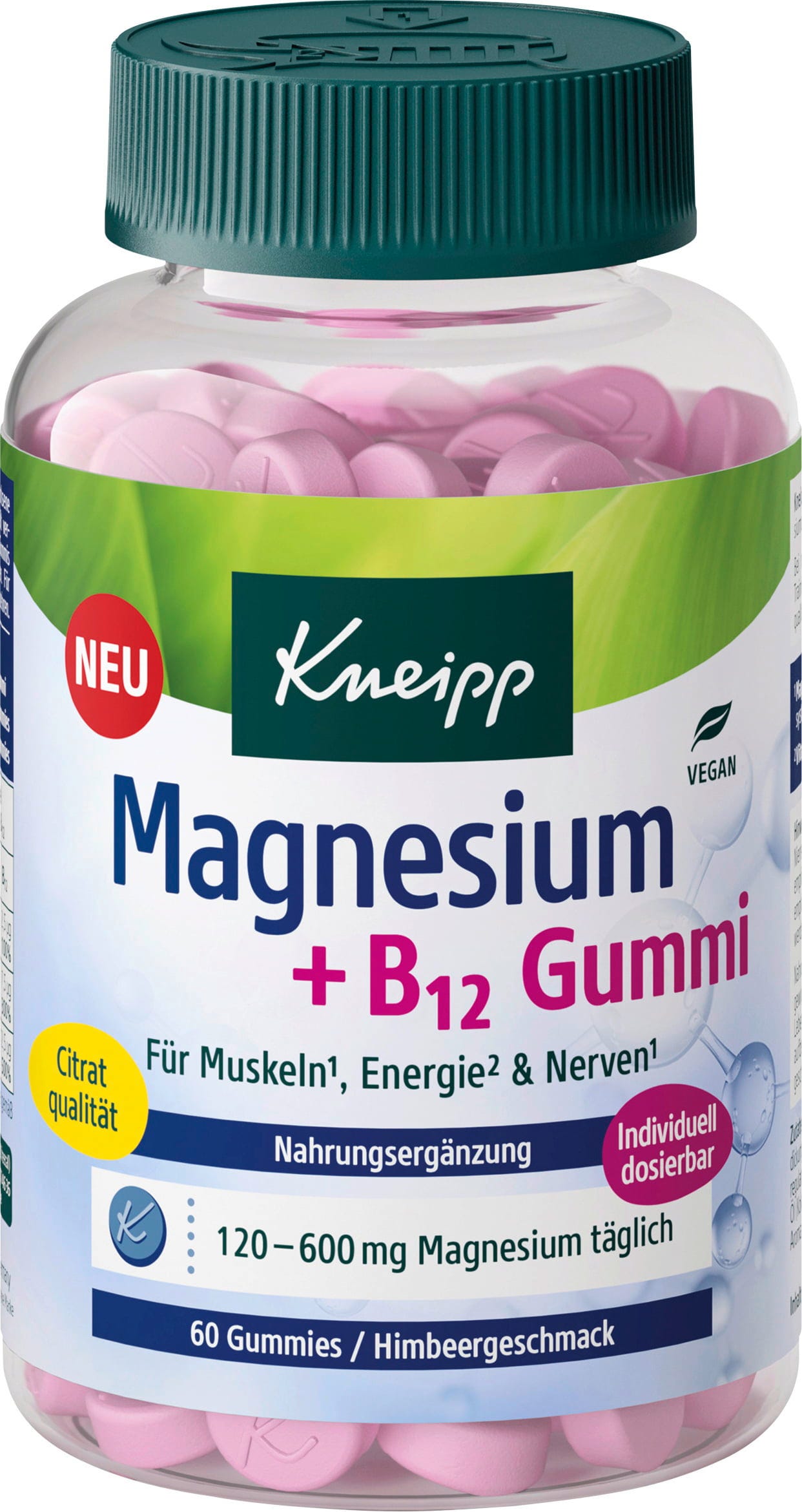 Las gominolas de frambuesa Magnesium + B12 de Kneipp son afrutadas y aromáticas, con sabor a frambuesa, agradables de masticar e ideales para el día a día. Combinan citrato de magnesio y vitamina B12 y son un tentempié cómodo para llevar siempre contigo. Son veganas, sin gluten y sin lactosa, formuladas sin aromas ni colorantes artificiales, y no solo tienen un sabor delicioso, sino que también se pueden integrar fácilmente en tu día a día.