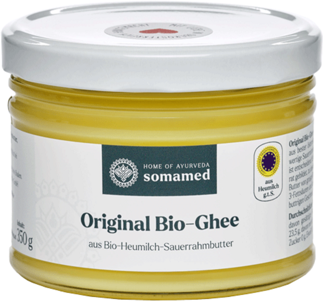 El ghee ecológico original se elabora artesanalmente en la Alta Austria a partir de mantequilla de nata ácida austriaca de calidad ecológica. Todo el proceso requiere mucho trabajo y tiempo. Esto garantiza una larga conservación y contribuye a la altísima calidad del producto. Las vitaminas A, D, E y K se conservan y el sabor se intensifica a cada segundo. El color amarillo dorado es también un indicio de la impecable calidad. El ghee tiene una tradición especialmente larga en Ayurveda y se sigue utilizando a diario. Ya sea en la cocina o durante los tratamientos Rasayana, el ghee es siempre la primera elección. El producto es especialmente popular en la cocina debido a su punto de inflamación extremadamente alto. Esto significa que el ghee no se oxida cuando se calienta.