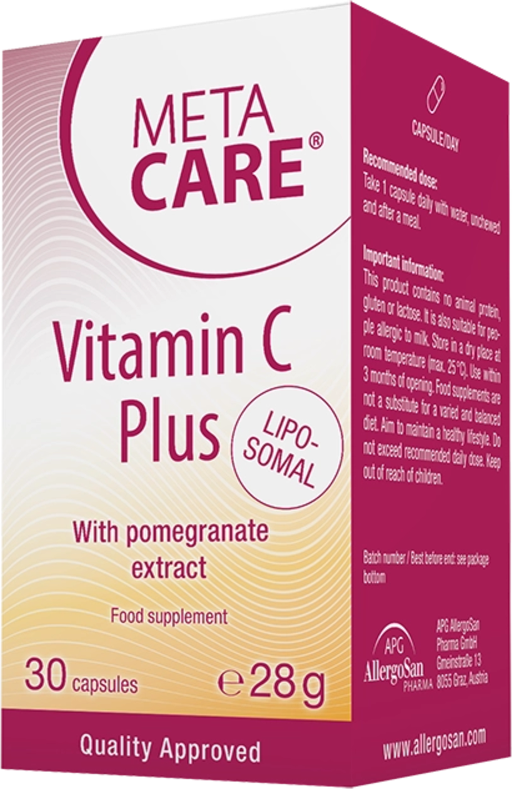 Las cápsulas META-CARE® Vitamin C Plus contienen extracto de acerola, extracto de cáscara de granada y extracto de jara. Gracias a la tecnología liposomal, la vitamina C está protegida de la acidez gástrica por una capa de fosfolípidos.