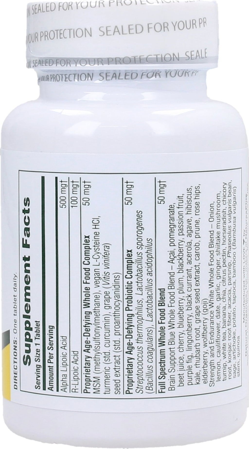 complejo completo anti-envejecimiento (metilsulfonilmetano (MSM), N-acetil-cisteína (NAC), cúrcuma, extracto de semillas de uva), mezcla probiótica antiedad propia (Lactobacillus acidophilus, Lactobacillus Sporogenes, Streptococcus salivarius), Mezcla nutritiva coloreada (mezcla completa verde para la energía y la depuración, mezcla completa blanca para la fuerza y la resistencia, mezcla completa amarilla para las defensas, mezcla completa azul para el cerebro, mezcla completa roja anti-envejecimiento), celulosa microcristalina, ácido esteárico,