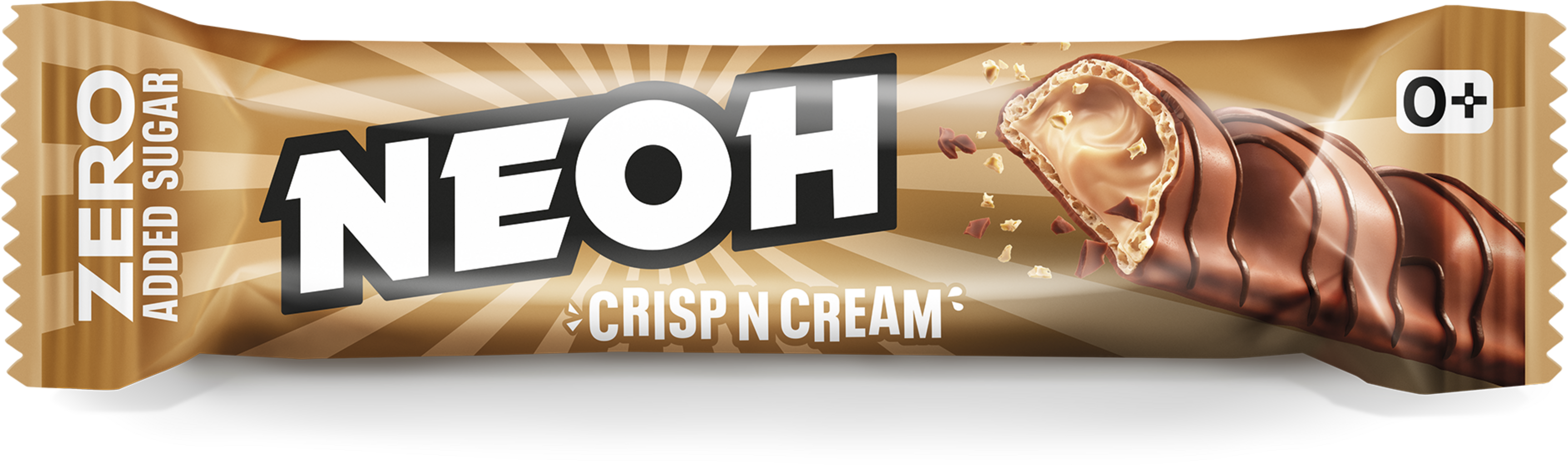 ¡CRISP N CREAM es la nueva estrella de NEOH! Esta barrita combina todo lo que te encanta: una oblea crujiente por fuera, un relleno de avellana deliciosamente cremoso por dentro y una cobertura de suave chocolate. ¿Y lo mejor? ¡Viene sin azúcar añadido!
