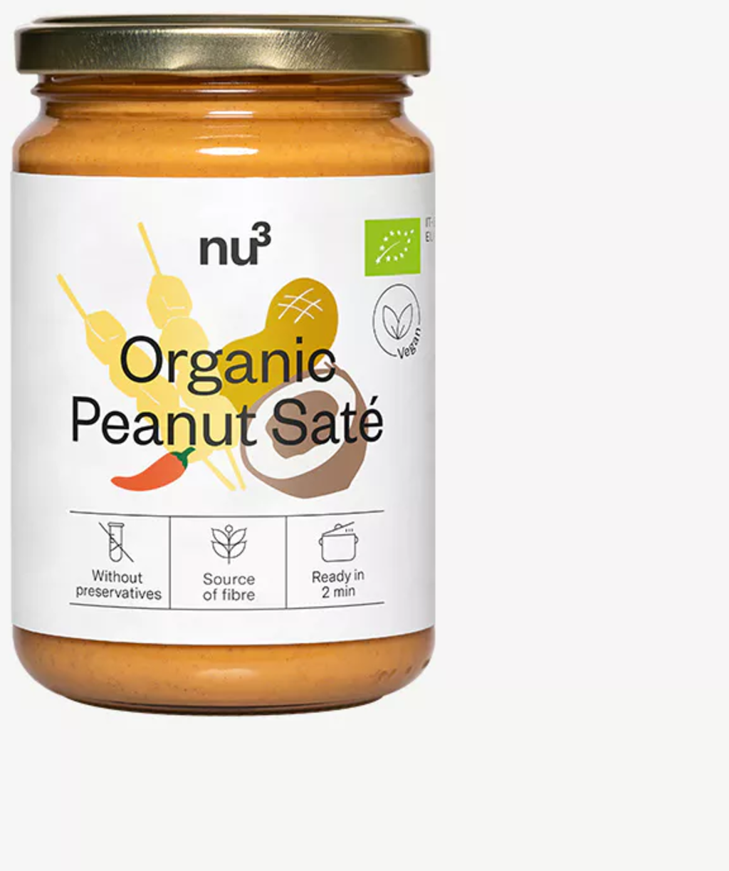 Descubre la salsa Saté de cacahuete de nu3, cremosa y con un sabor especiado. Combina cacahuetes tostados, leche de coco, tomates y especias asiáticas en una salsa versátil, ideal para bowls, platos de verduras o como marinada. Es totalmente vegetal, vegana y elaborada con ingredientes 100 % ecológicos.