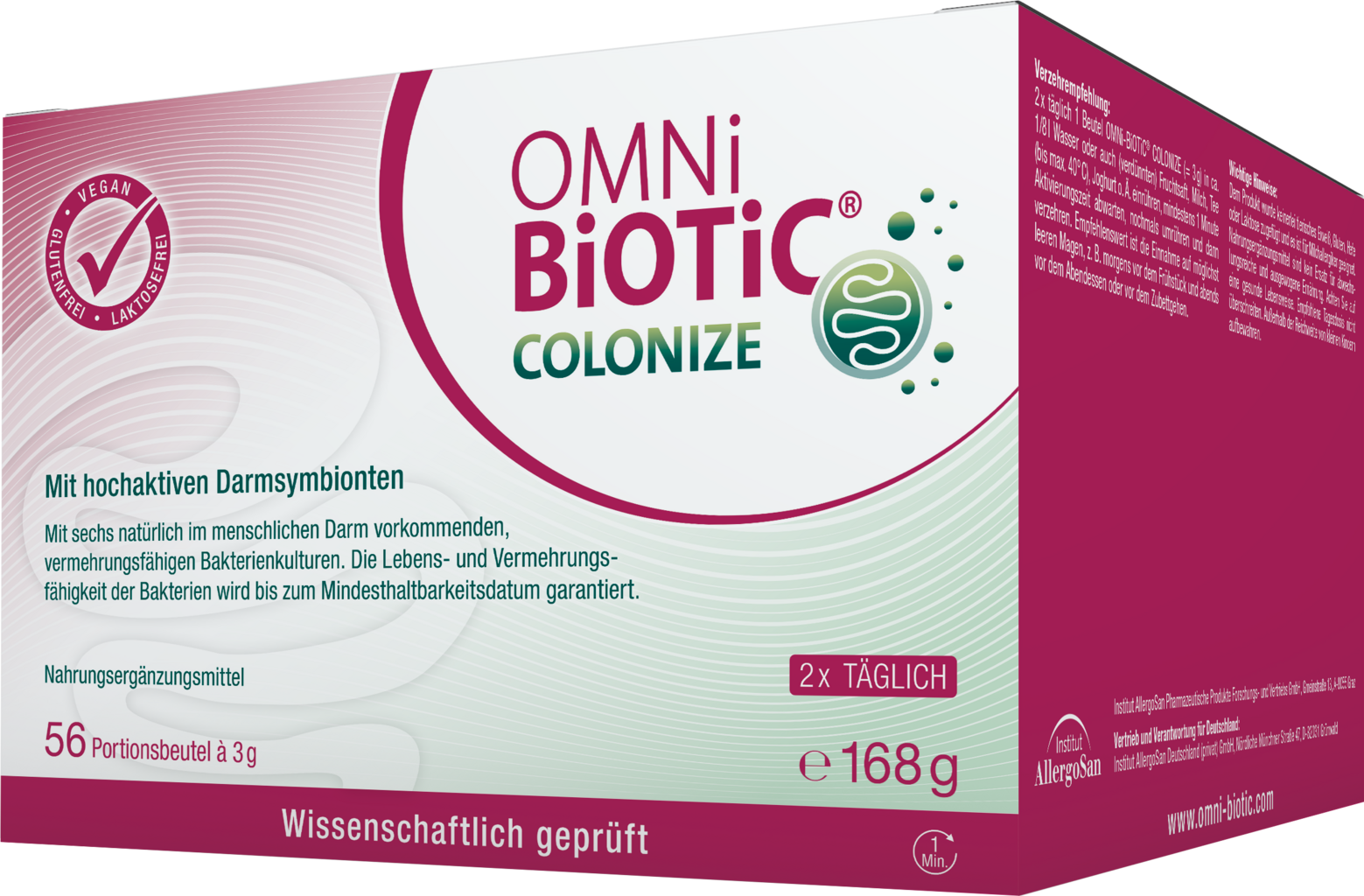 - Mezcla 1 sobre de OMNi-BiOTiC® COLONIZE (= 3 g) en aproximadamente 1/8 L de agua dos veces al día. Espera al menos 1 minuto para que se active. Vuelve a remover después y ya puedes tomarlo.