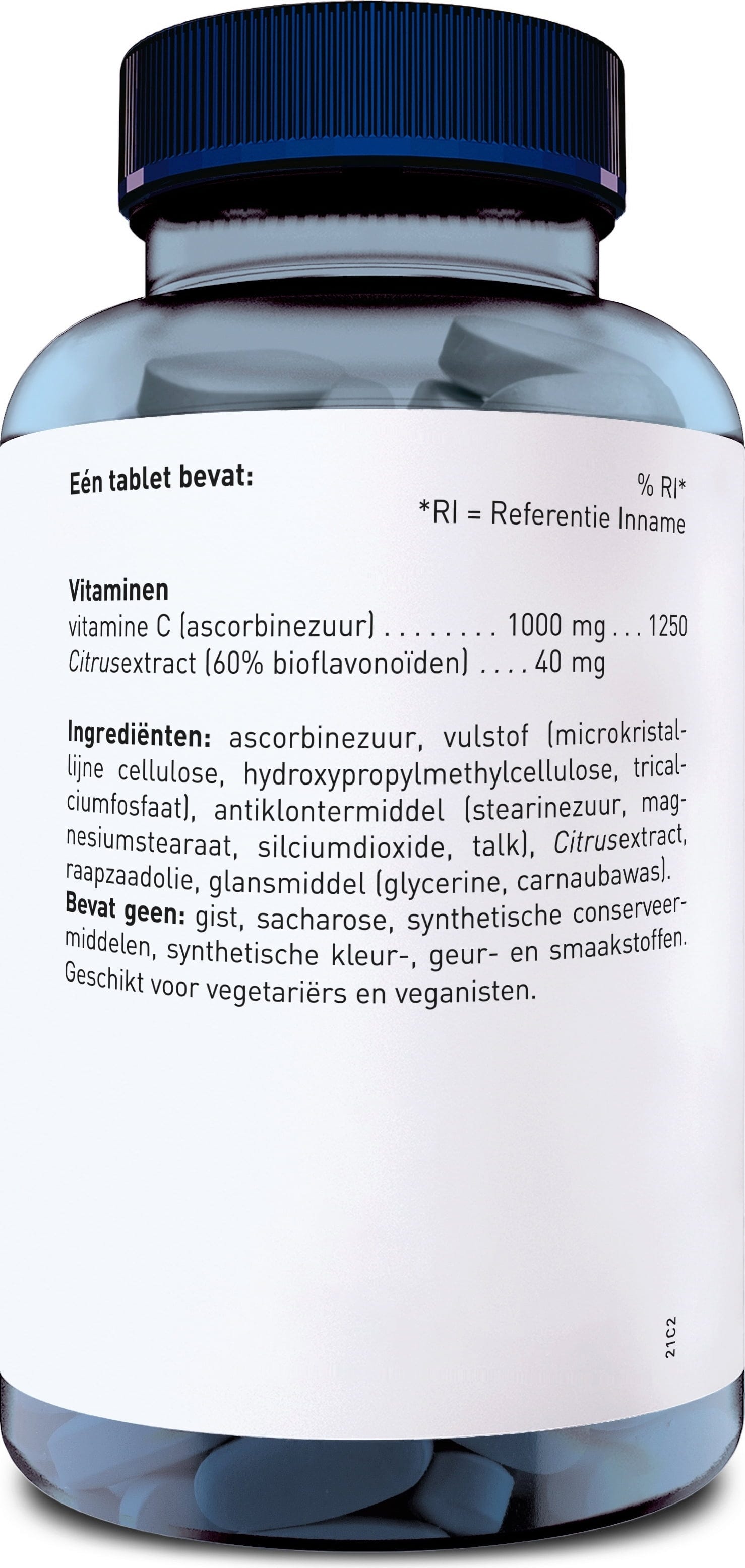 ácido ascórbico, ingrediente de relleno (celulosa microcristalina, hidroxipropilmetilcelulosa, fosfatos de calcio), antiaglomerante (ácidos grasos, sal de magnesio de ácidos grasos, dióxido de silicio, Talkum), extracto de cítricos, aceite de colza, agente de recubrimiento (glicerina, cera de carnauba)