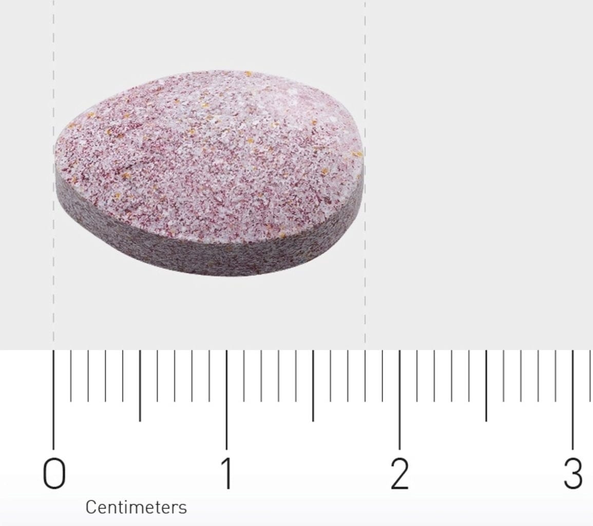 calcio (Calciumcarbonat, citrato de calcio), Edulcorantes (dextrosa), magnesio (Magnesiumcarbonat, citrato de magnesio), Ácido L-ascórbico, citrato de zinc, colorante (remolacha en polvo), Edulcorantes (xilitol), antiaglomerante (ácidos grasos, dióxido de silicio, sal de magnesio de ácidos grasos), saborizantes (aroma de frambuesa), niacinamida, vitamina B5 (pantotenato de calcio), acidulante (ácido cítrico), vitamina E (D-alfa-tocoferol), fumarato ferroso, bitartrato de colina, sulfato de manganeso, riboflavina, mononitrato de tiamina, piridoxal 5' fosfato, Gluconato de cobre, inositol, vitamina A (acetato de retinol), ácido fólico, Selenato de sodio (selenio) (selenito de sodio, L-selenometionina), yoduro de potasio, Molibdato de sodio, biotina, colecalciferol, picolinato de cromo, cianocobalamina
