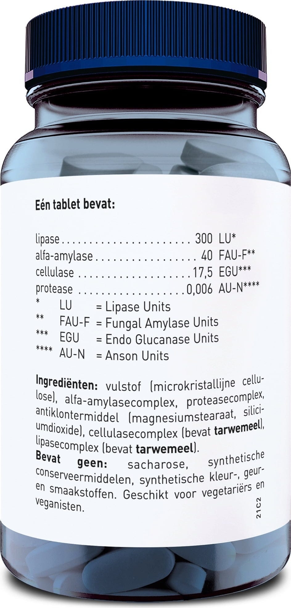 complejo de lipasas (trigo), ingrediente de relleno (celulosa microcristalina), Complejo de proteasas, alfa amilasa, antiaglomerante (sal de magnesio de ácidos grasos, dióxido de silicio), complejo de celulasas (trigo)