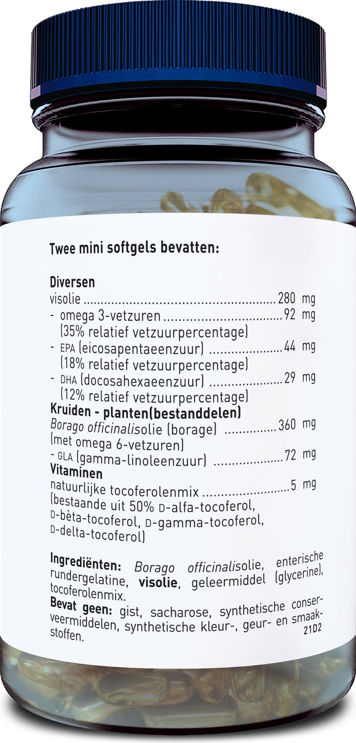 Aceite de borraja, cubierta de la cápsula (Gelatina de ternera, glicerina), aceite de pescado (Pescado), antioxidante (mezcla de tocoferoles naturales)