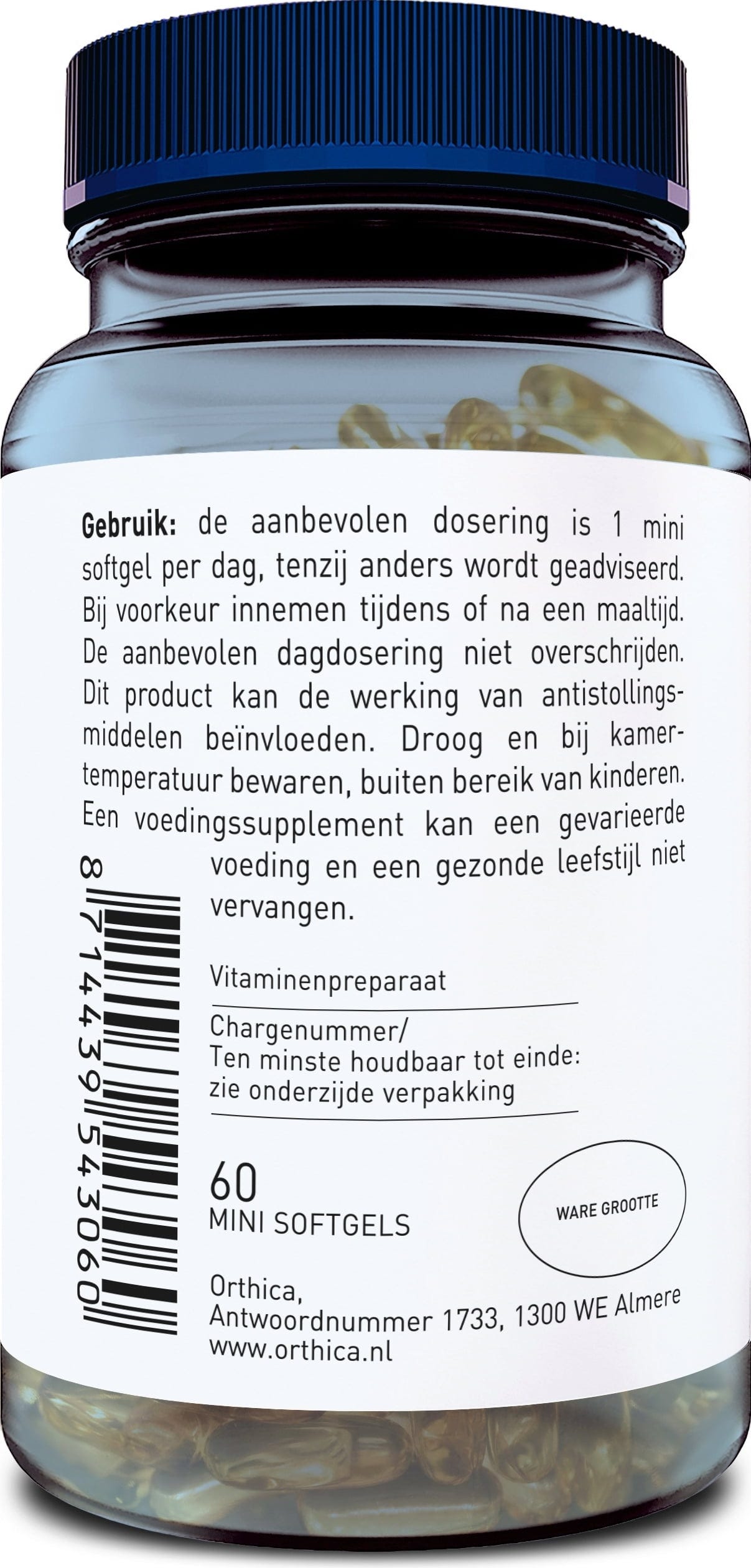 Este producto proporciona un aporte concentrado de vitamina K2 en forma de menaquinona-7 (MK-7). La vitamina K contribuye a la coagulación normal de la sangre y también ayuda a mantener los huesos en buen estado. Las cápsulas contienen la vitamina en una solución oleosa, lo que facilita su ingesta en la rutina diaria. La producción se basa en una fuente vegetal obtenida a partir de soja fermentada. La fórmula se centra exclusivamente en este único nutriente, lo que permite una suplementación específica o una combinación flexible con otros productos.