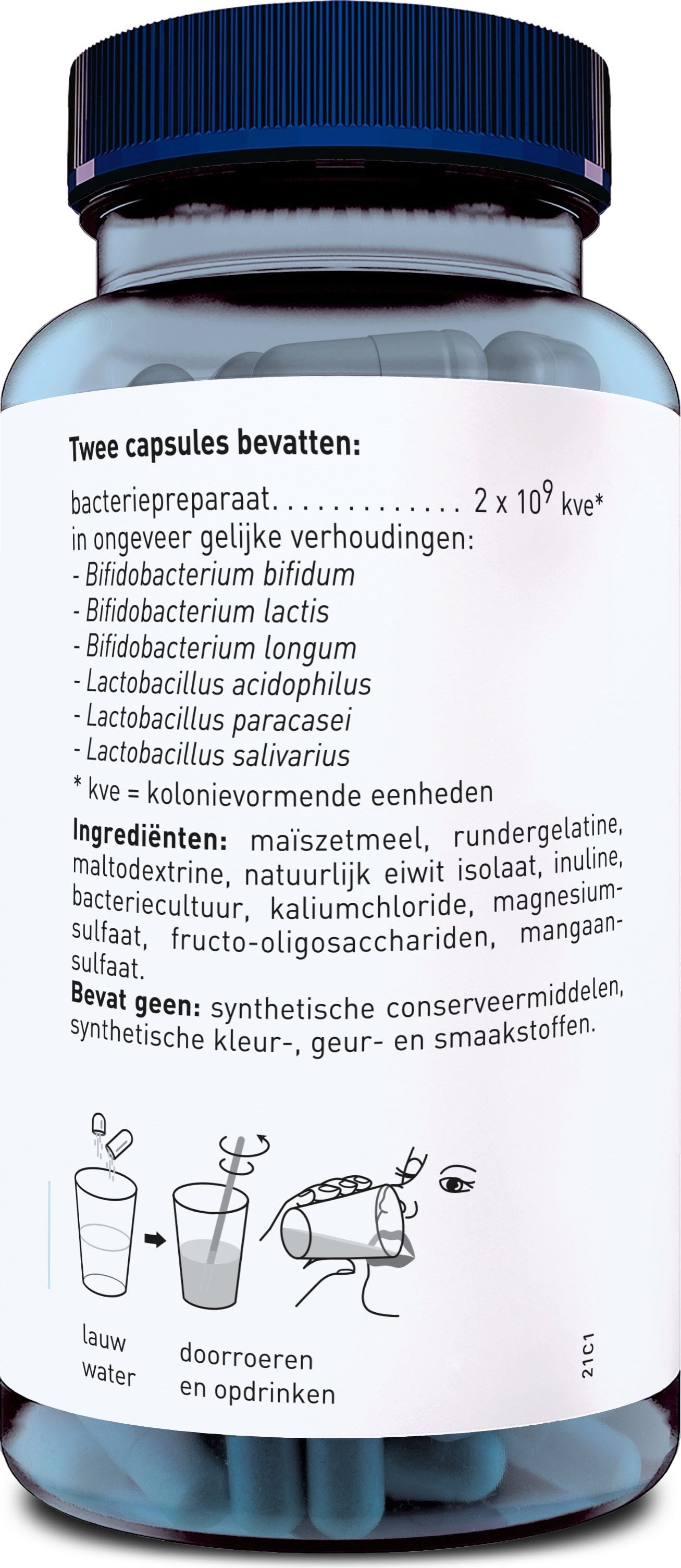 maicena, cubierta de la cápsula (Gelatina de ternera), maltodextrina, proteínas naturales aisladas, inulina, fructo-oligosacáridos, sulfato de manganeso, cloruro de potasio, sulfato de magnesio, complejo probiótico
