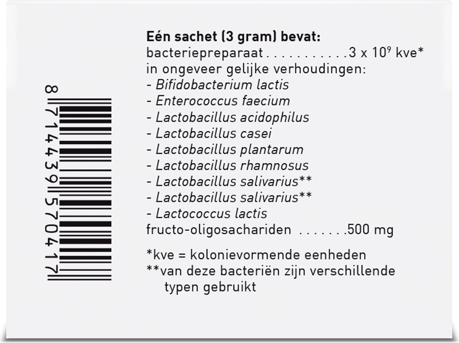 Este producto se caracteriza por una amplia combinación de diez cultivos bacterianos diferentes, que incluyen diversas cepas de bifidobacterias y lactobacilos. Cada sobre contiene una cantidad exactamente dosificada de polvo fácilmente soluble en agua templada.