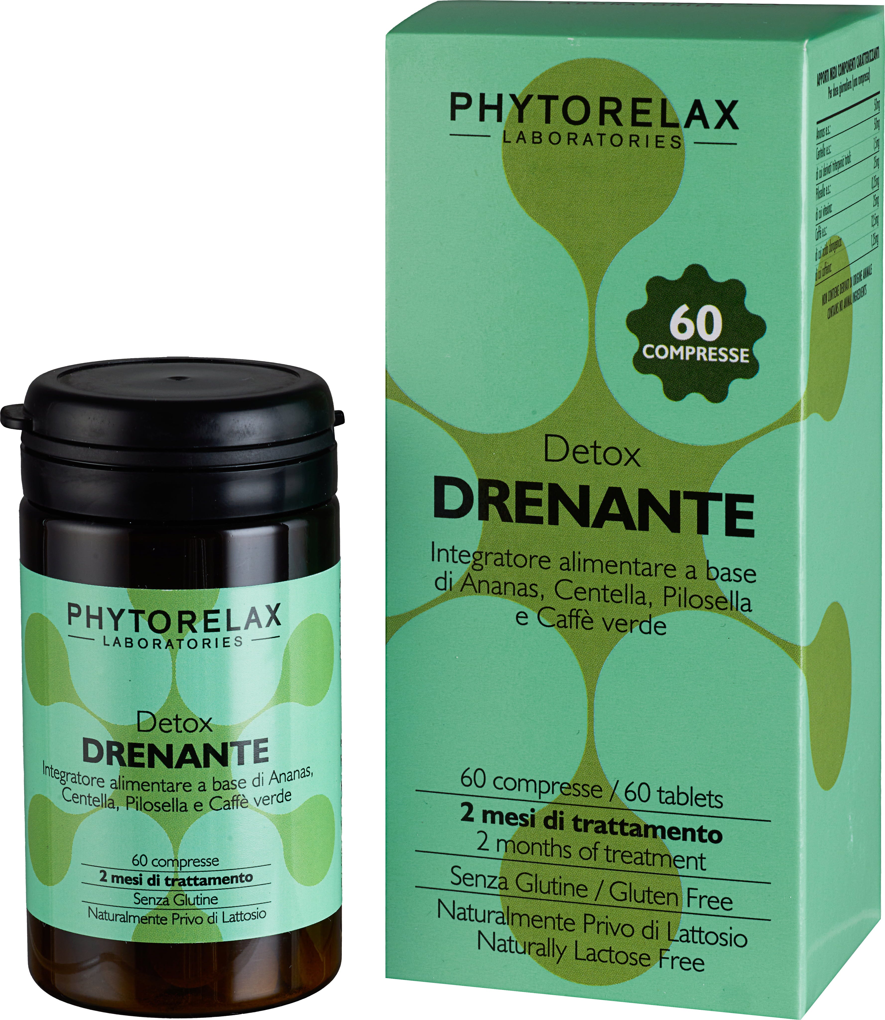 Drenante de Phytorelax es un complemento alimenticio en forma de comprimidos, basado en una mezcla de piña, centella asiática, pilosella y café verde, formulado de manera esencial y sin aditivos superfluos. La dosis diaria compacta facilita la integración de este producto en la rutina diaria.