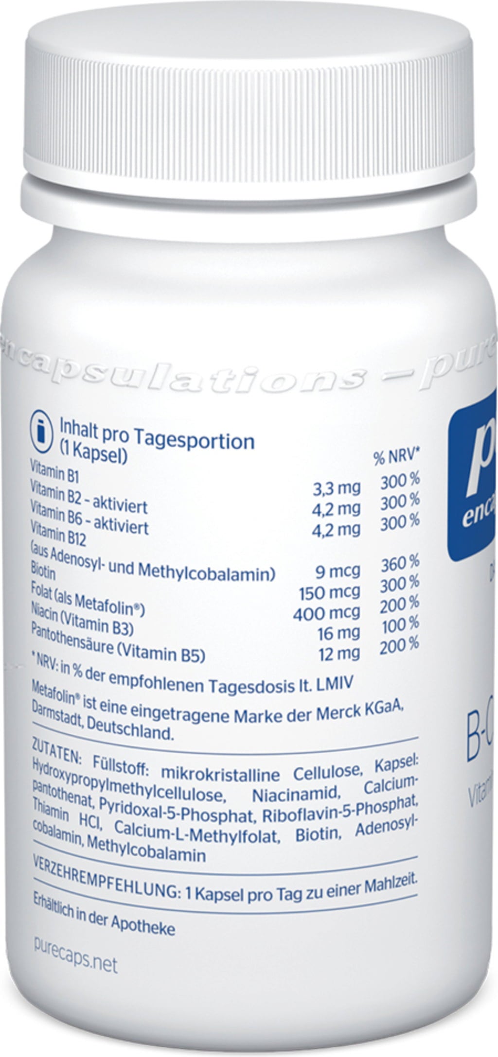 celulosa microcristalina[1], hidroxipropilmetilcelulosa[2], niacinamida, pantotenato de calcio, piridoxal 5' fosfato, riboflavina-5-fosfato,