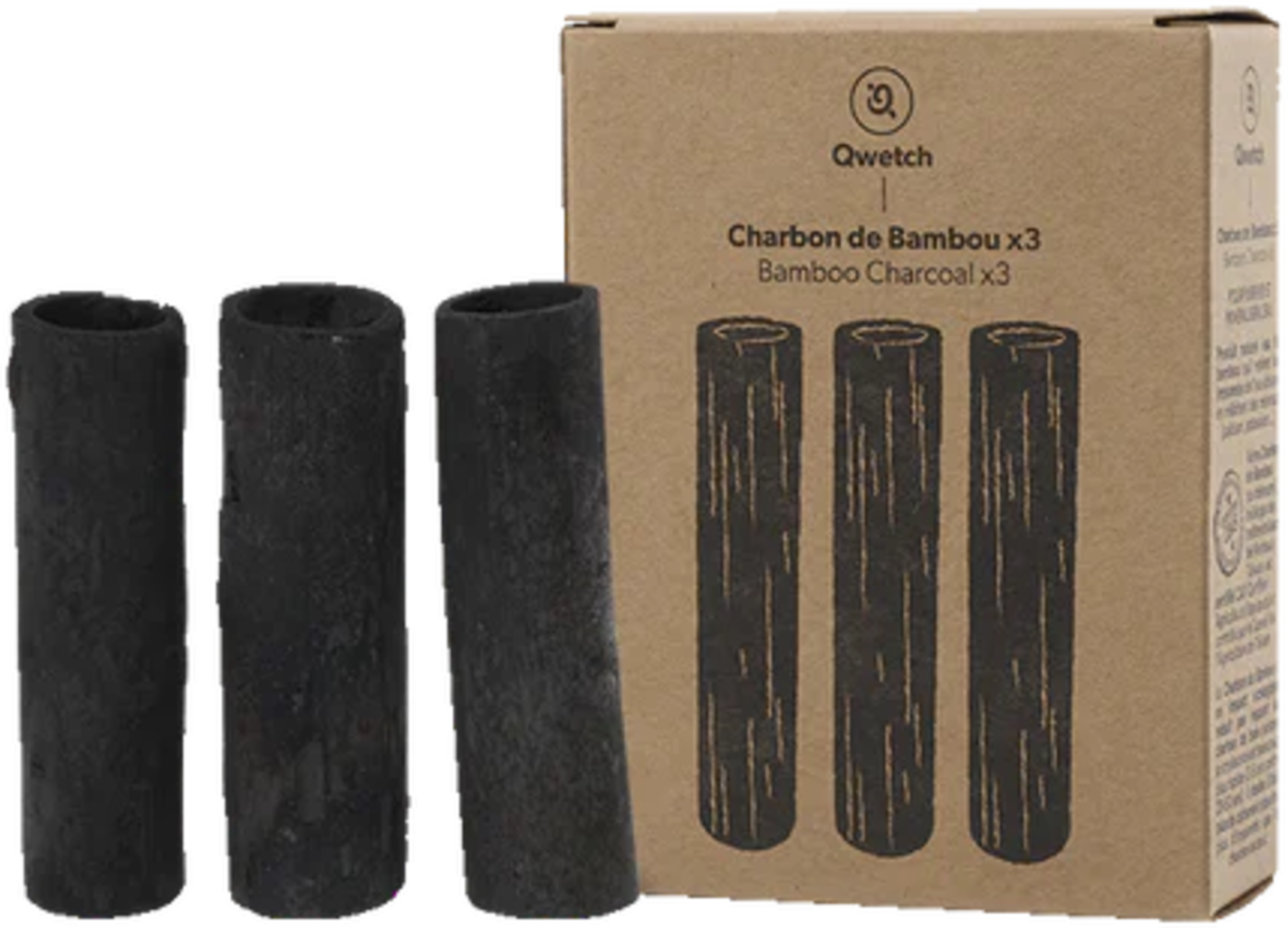 El carbón de bambú de Qwetch purifica y mineraliza el agua. El carbón retiene las impurezas (especialmente el cloro) liberando, entre otras sustancias, magnesio, calcio o potasio. En cuanto al carbón de bambú, Qwetch presta especial atención al origen, evitando tratamientos químicos y garantizando buenas condiciones de crecimiento.